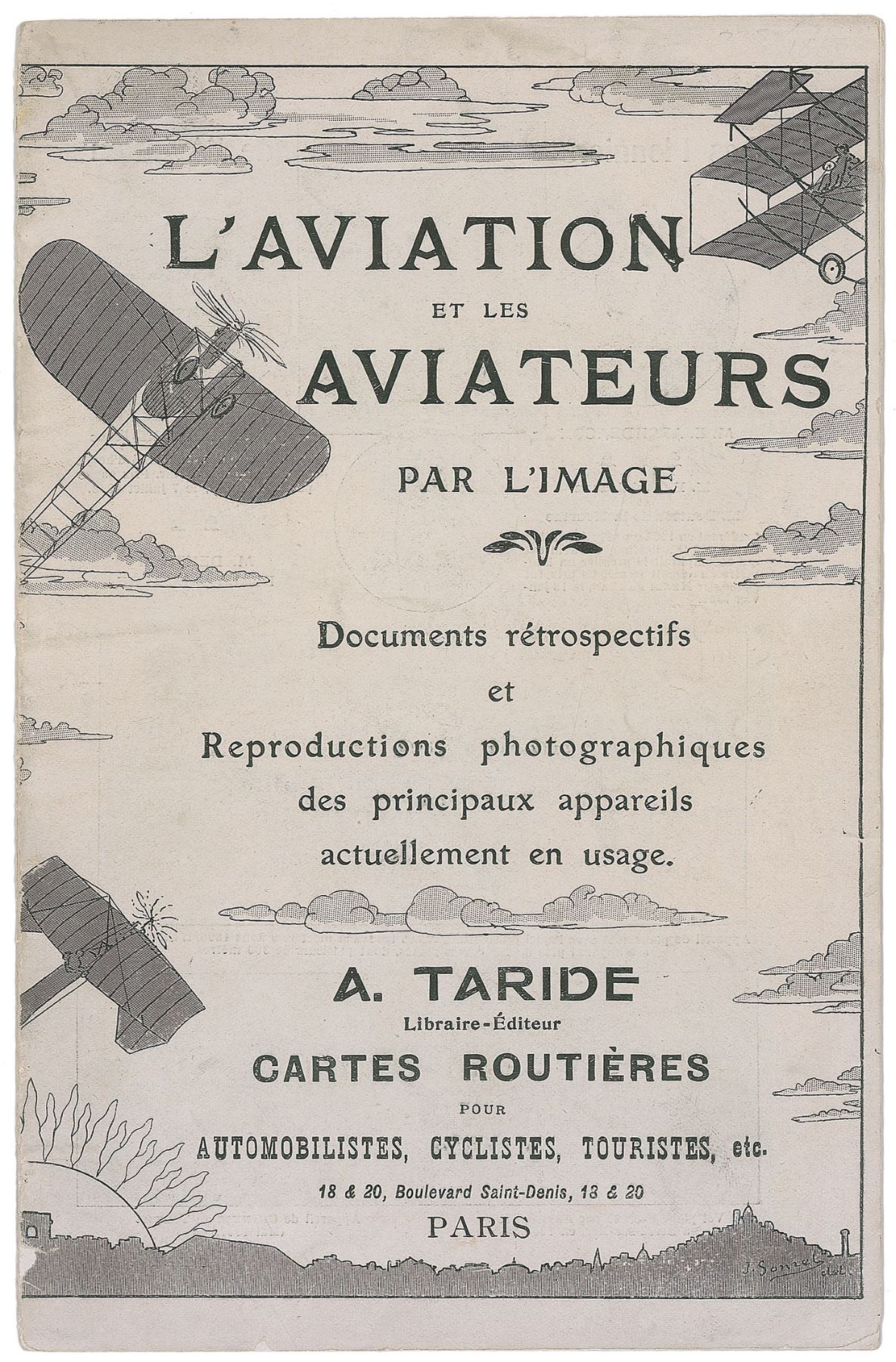 Booklet, in French, entitled, "L'Aviation et les Aviateurs," 6.25 x 9.5, full of photos of various airplanes and their pilots, including Santos-Dumont, Glenn Curtiss, and Louis Bleriot. Partial separation to front and back covers, and expected handling wear, otherwise fine condition.