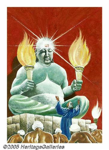 <B>L. B. Cole - Classics Illustrated #30 "The Moonstone" Painted Cover Original Art (Gilberton, 1960).</B></I> L.B. Cole was a traveler in the exotic -- his wild, poster-like scenes for the Star Publishing comics line are celebrated by comics fans for their unorthodox designs and fantastic hues. In 1959, Cole worked for Gilberton as an editor just before heading over to Dell Comics to take a position as their art director in 1961. Cole reworked the original Don Rico cover design for Wilkie Collins' novel, <B>The Moonstone</B></I>, and his realistic rendering captures a ritual of worship in progress. For Wilkie Collins, the Moonstone was a symbol of all that humanity strives for, material and spiritual. The history of the Moonstone is a history of thefts -- to its temporary European possessors, the Moonstone was a bauble and a commodity, but to its faithful guardians, the Brahmins, it is a sacred artifact beyond price. The novel opens in India with John Herncastle's theft of the gem in battle, and ends with Mr. Murthwaite's account of the restoration of the gleaming yellow diamond to the forehead of the Hindu deity of the Moon eight centuries later. The painting has an image area of 14" x 20.5" and the art is in Excellent condition. L. B.Cole signed the painting at the lower right.