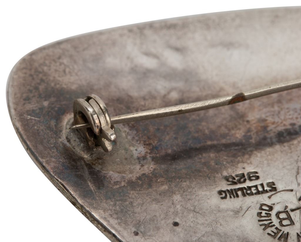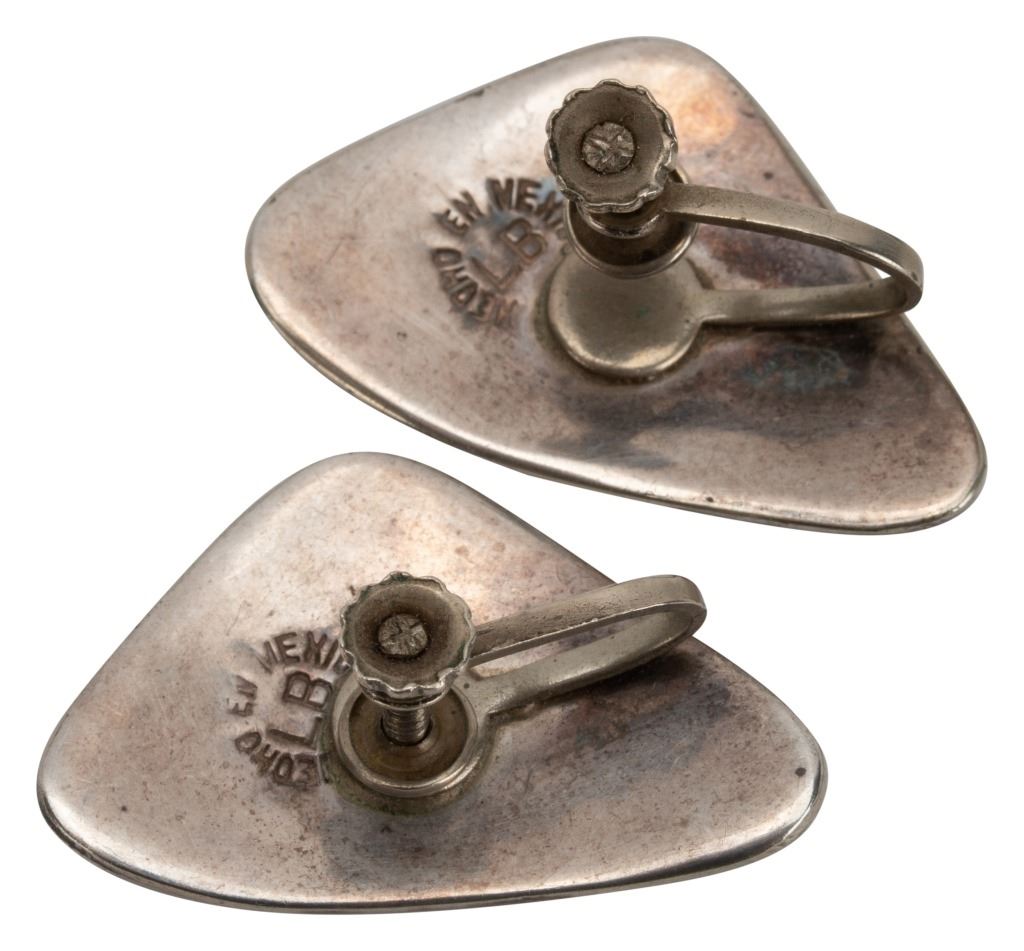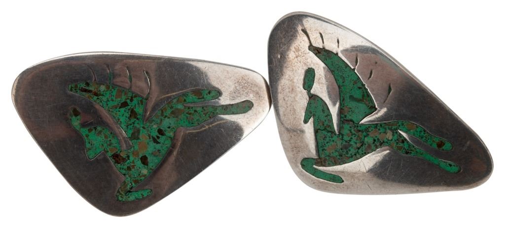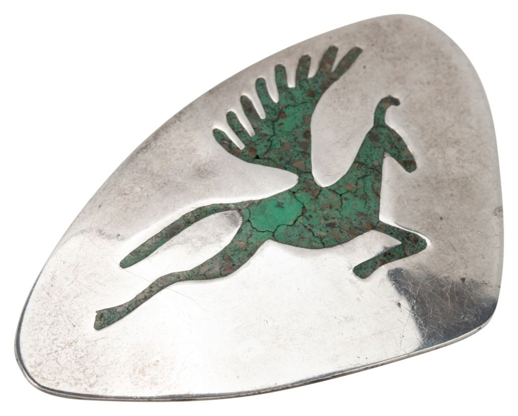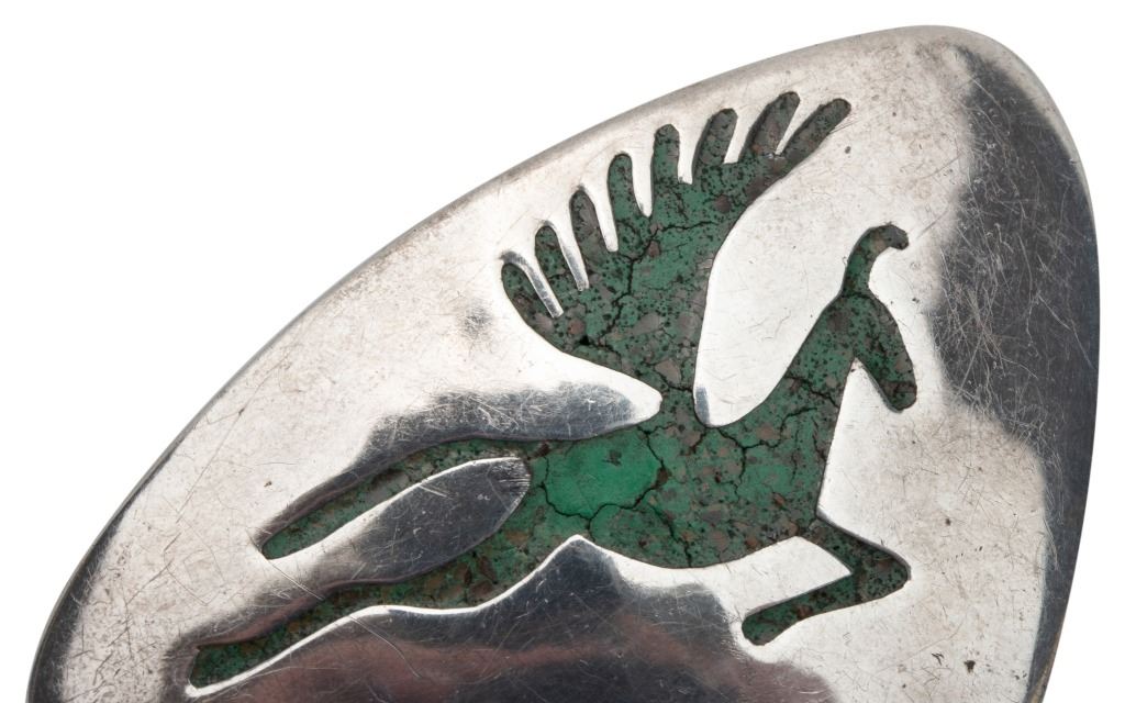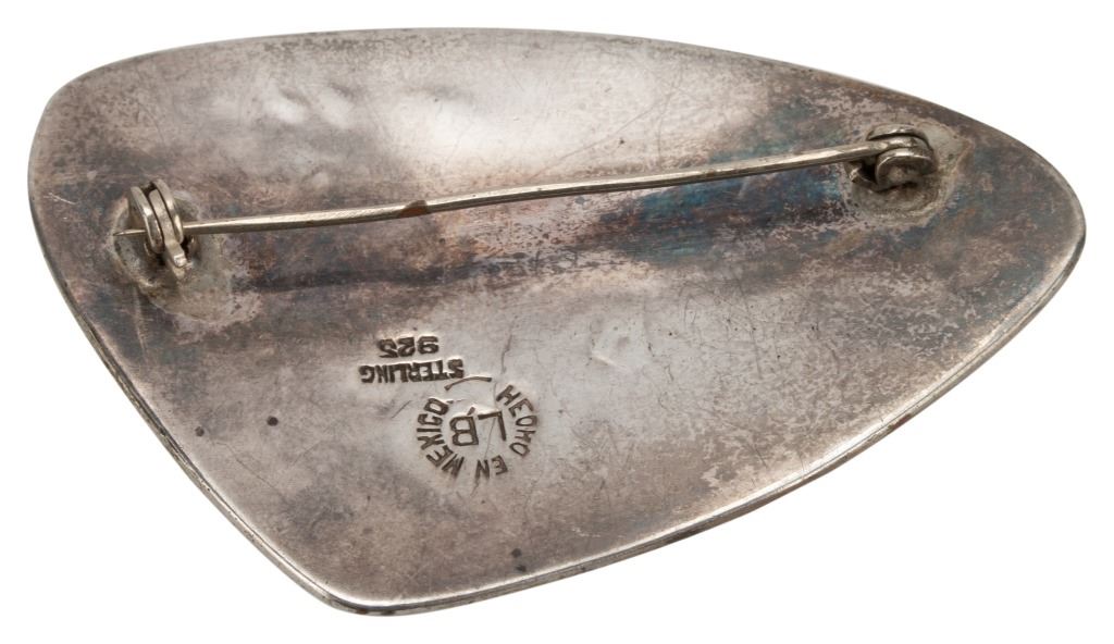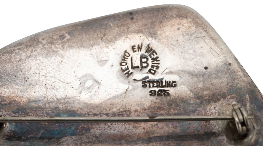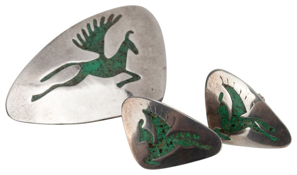 Item/Description: Signed Southwestern Mexican Modernist demi- parure consists of a brooch and matching screw back earrings. Hand-crafted in Sterling Silver by L. B. studio artisan silversmith. Outlined figure of a winged horse accented with inlaid crushed turquoise. Beautiful workmanship. Winged horses. Pegasus. Magical. Mystical. Hallmarked on each piece: Hecho En Mexico L B Sterling 925.