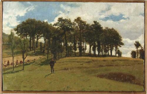 L. BUSI (European, 19th Century) LANDSCAPE WITH FIGURES. Oil on canvas scene shows a man standing in grass covered field next to a hayfield being harvested by seven other people. Tall trees line the hillside under blue and white cloud sky. Signed bottom left “L. Busi/90”?. Housed in a simple wood frame. SIZE: 11-1/4” x 18”. CONDITION: Good, uneven varnish. 9-26982