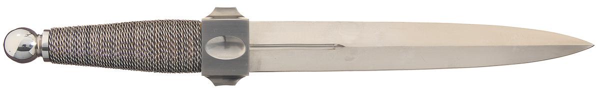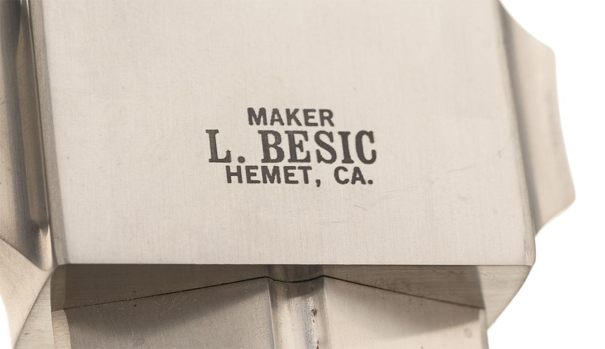 Handcrafted by California knifemaker L. Besic, this dagger has a 9 1/4 inch fuller blade. The guard with a thumb groove is marked "MAKER / L. BESIC / HEMET, CA." The handle is wrapped in twisted silver wire. OAL: 15 1/4".