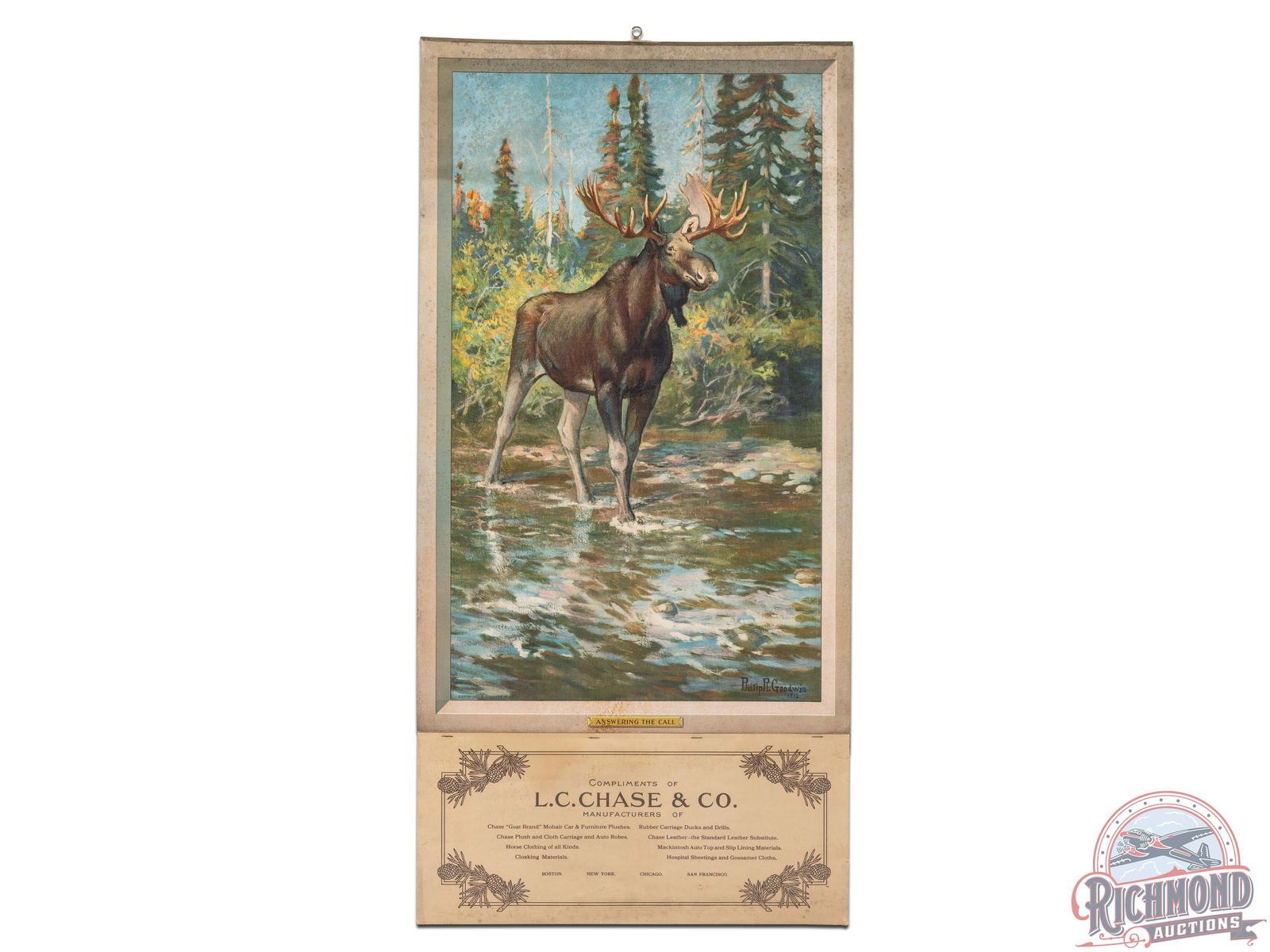 Excellent canvas lithograph advertising calendar featuring a moose in "Answering The Call" by renowned artist Philip R. Goodwin. Includes an unused calendar pad that is believed to be complete and from 1913 or shortly thereafter. Exhibits great color with a few minor creases and some age spotting throughout. Small tear to the calendar pad. L.C. Chase was a garment and textile manufacturer in Boston, New York, Chicago and San Francisco. Strong eye appeal and in great condition overall. Includes top band. Shink wrapped and secured to foamboard. Marked Copyright LC Chase & Co on lower left with artist printed signature on right. 37" H x 18" W.