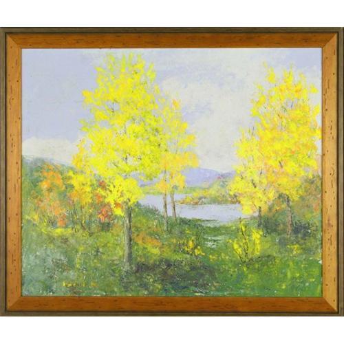 This is an impressionistic style landscape that uses bright, vibrant colors. The use of warm yellows an reds placed against a neutralized, cool blue sky help to draw attention and creates great atmospheric perspective. Beautifully framed in a rustic, two-tone wood frame that accents the warm tones throughout the painting. The total size of this attractively rendered painting is 23? x 27?.