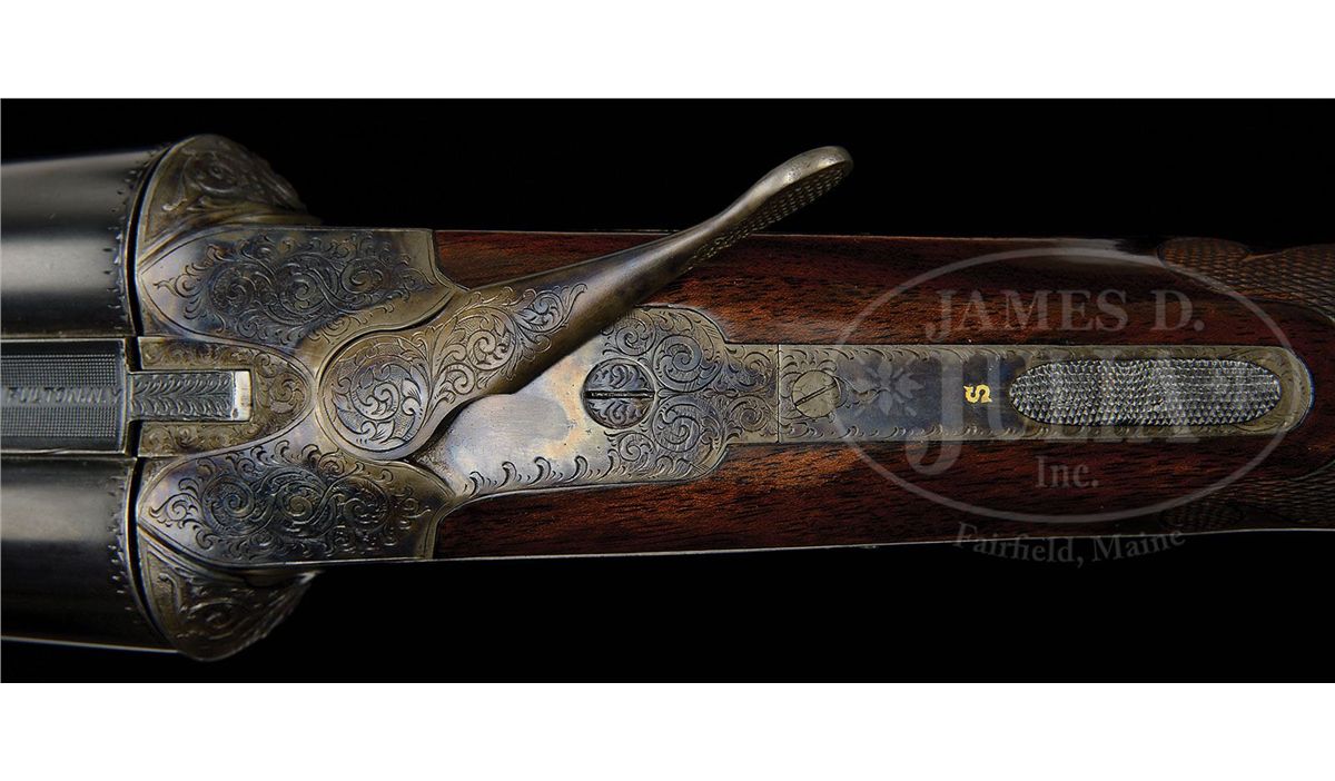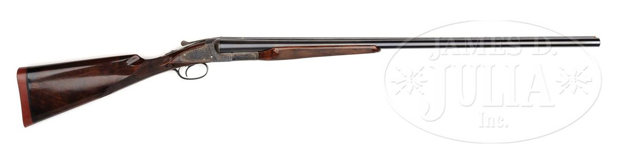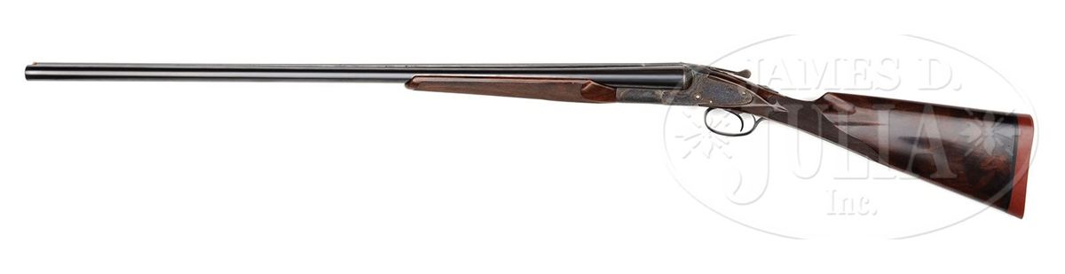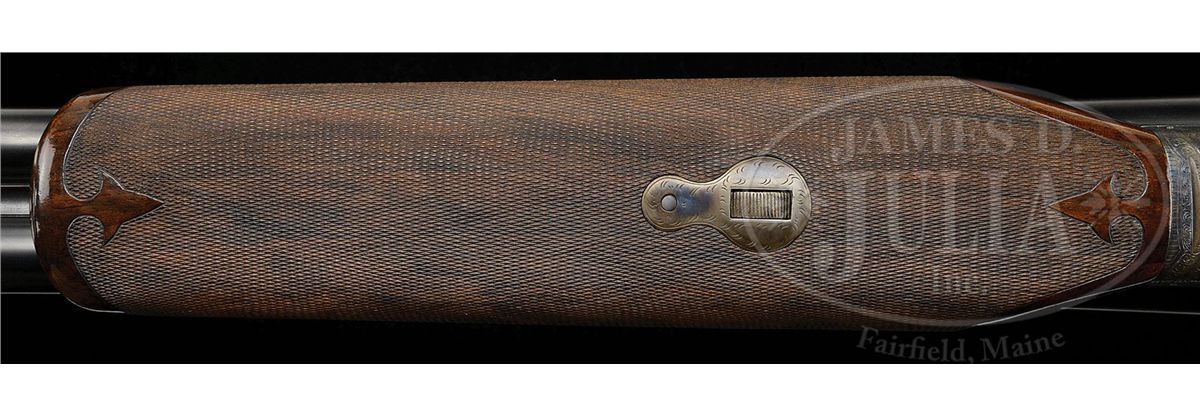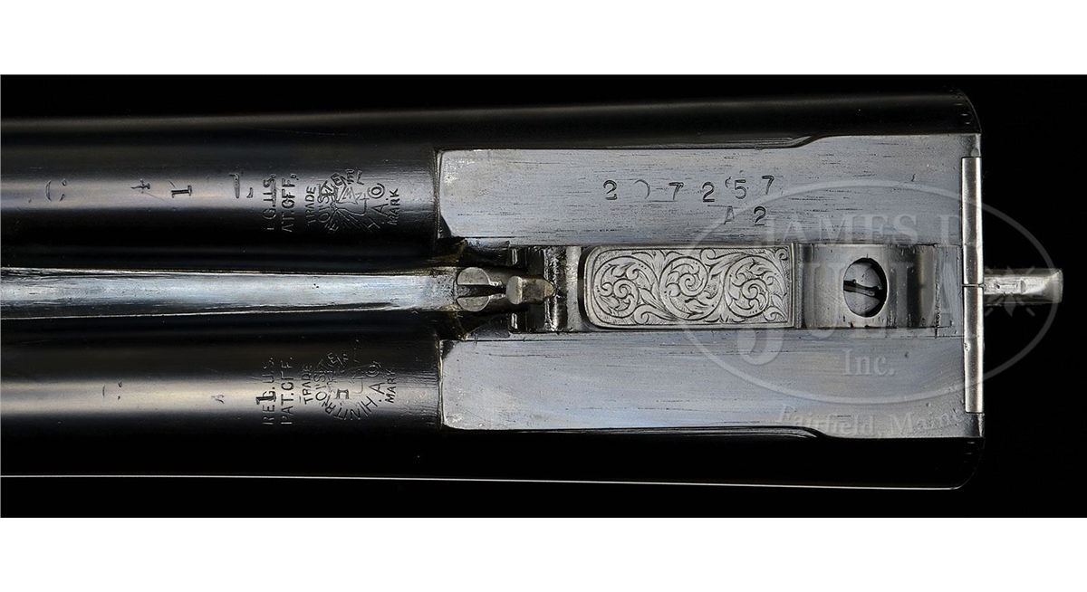 SN 207257. Cal. 12 ga. 32" Bbls with matted, concave rib mounted with two ivory beads, are marked "Hunter Arm Co. Fulton, N. Y." on rib extension. Bbl flats are stamped with SN and "A2", bottoms of bbls with Hunter Nitro Steel trademarks. There is no scroll engraving at breech ends. Case hardened action is engraved with patent dates and SN on water table, and features non-automatic safety (SAFE inlaid in gold) and Hunter One Trigger. Action is engraved with well cut, large, open, shaded scroll at nearly full coverage with setter on left and pointer on right side of front portion. Lockplates are fully scroll engraved with "L. C. Smith" in small riband on each side. Fences are elegantly carved in full relief, open, scrolled acanthus with finely stippled background. Scroll engraved trigger guard has SN at grip. Lightly figured and somewhat marbled American walnut straight grip buttstock measures 14" over red, Silver type pad, and has swept pattern wraparound borderless checkering with fleur-di-lis piercing pattern, at grip. Matching beavertail ejector forend has typical J-spring and knurled latch in guitar shaped escutcheon. Bore diameter: left-.730, right -.728. Bore restrictions: left -.037 (Full), right -.038 (Full). Wall thickness: left -.018, right -.021. Drop at heel: 2-7/16", drop at comb: 1-5/16". Weight: 8 lbs. 3 oz. LOP: 14". CONDITION: Excellent, as completely refurbished, retaining nearly all new custom finishes on wood and metal, with a few light handling marks on metal. Wood finish is rubbing through at comb and sharp edges, and has some light scratches and pings. Checkering is slightly worn. Bores are bright and shiny with some dents on bottom 2" in front of forend. Action is tight. Ejectors are in time. Trigger works. A very well done upgrade. 4-49104 MGM293