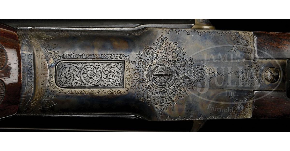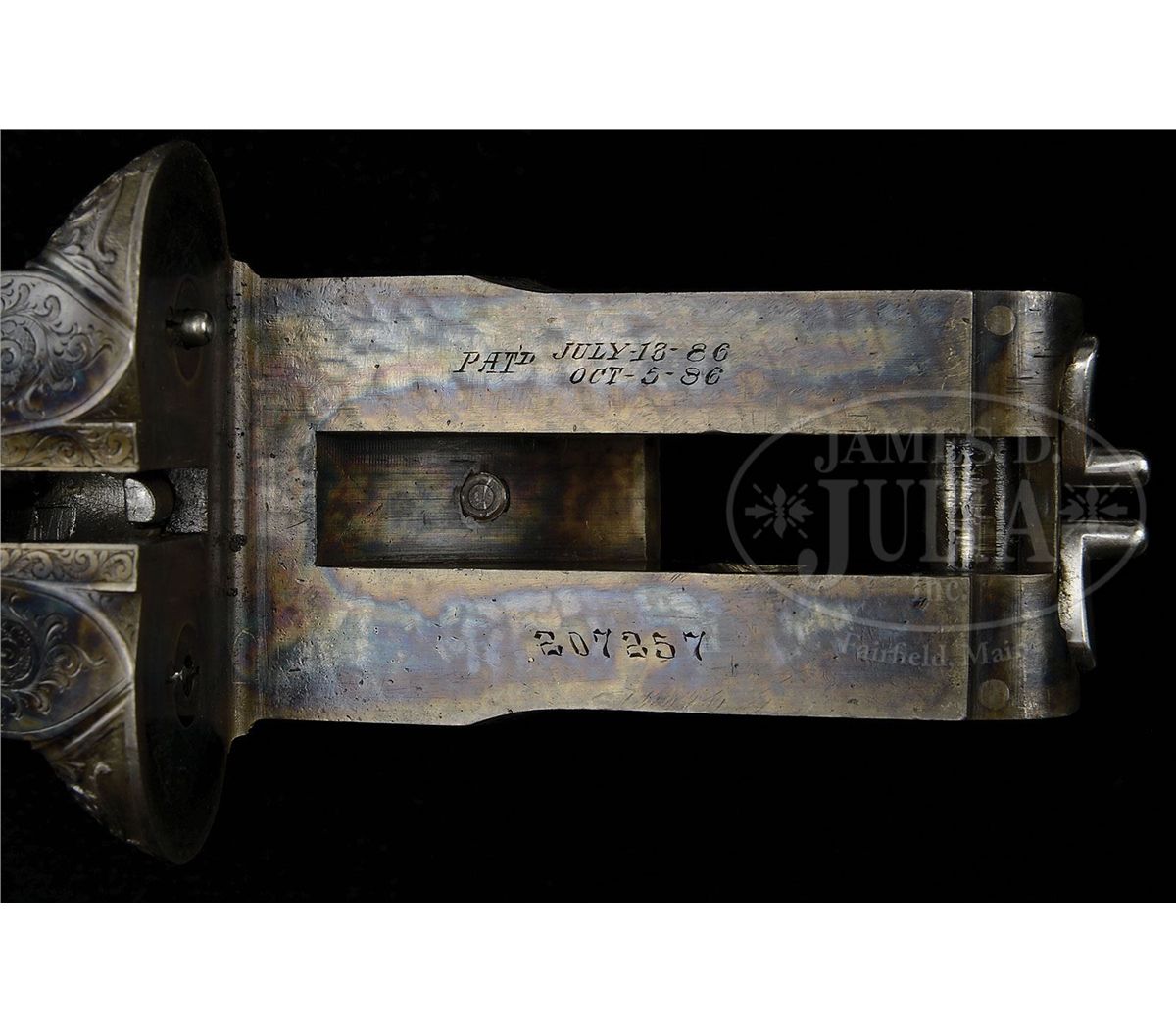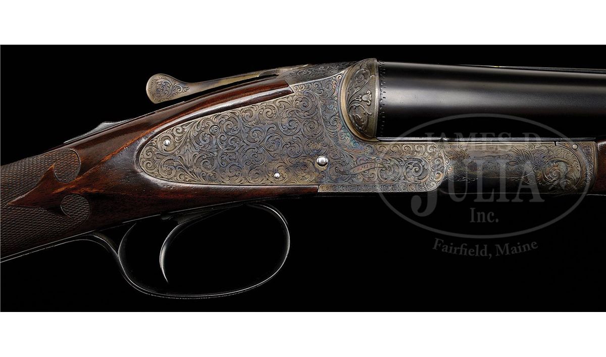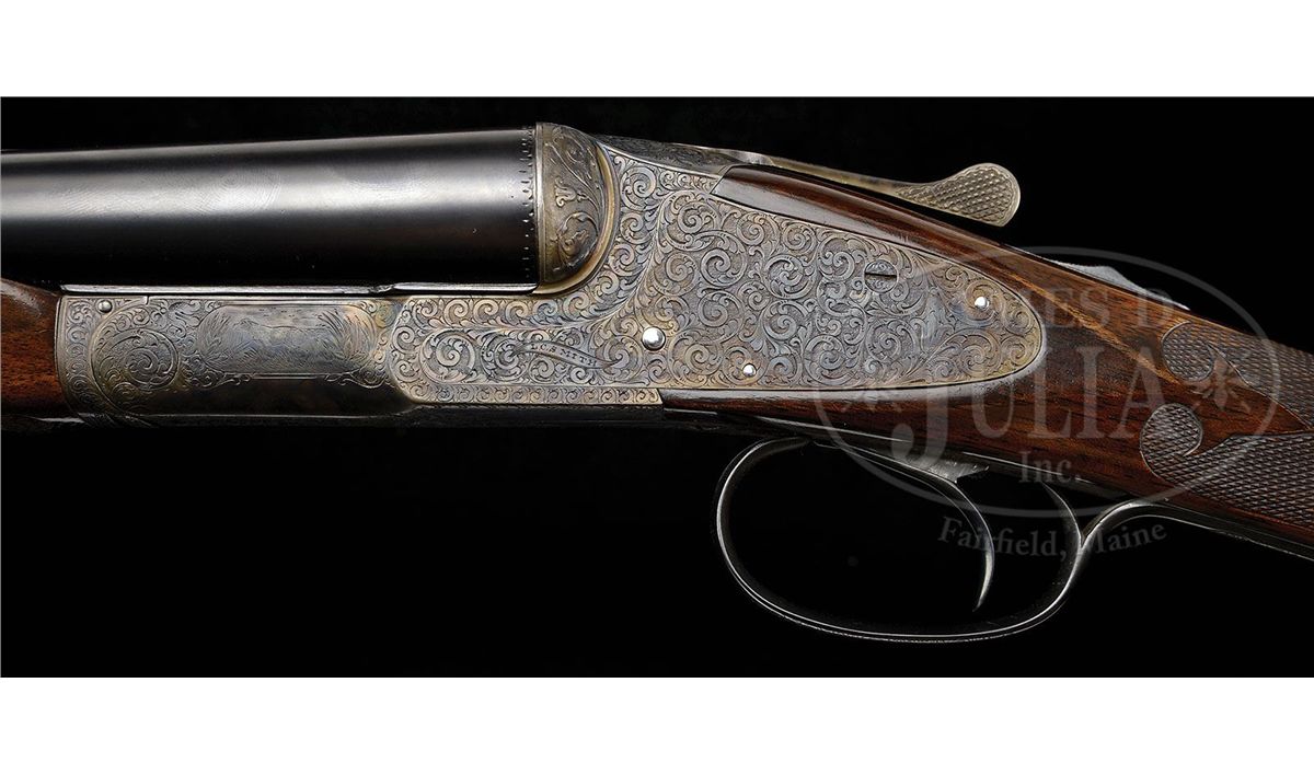 SN 207257. Cal. 12 ga. 32" Bbls with matted, concave rib mounted with two ivory beads, are marked "Hunter Arm Co. Fulton, N. Y." on rib extension. Bbl flats are stamped with SN and "A2", bottoms of bbls with Hunter Nitro Steel trademarks. There is no scroll engraving at breech ends. Case hardened action is engraved with patent dates and SN on water table, and features non-automatic safety (SAFE inlaid in gold) and Hunter One Trigger. Action is engraved with well cut, large, open, shaded scroll at nearly full coverage with setter on left and pointer on right side of front portion. Lockplates are fully scroll engraved with "L. C. Smith" in small riband on each side. Fences are elegantly carved in full relief, open, scrolled acanthus with finely stippled background. Scroll engraved trigger guard has SN at grip. Lightly figured and somewhat marbled American walnut straight grip buttstock measures 14" over red, Silver type pad, and has swept pattern wraparound borderless checkering with fleur-di-lis piercing pattern, at grip. Matching beavertail ejector forend has typical J-spring and knurled latch in guitar shaped escutcheon. Bore diameter: left-.730, right -.728. Bore restrictions: left -.037 (Full), right -.038 (Full). Wall thickness: left -.018, right -.021. Drop at heel: 2-7/16", drop at comb: 1-5/16". Weight: 8 lbs. 3 oz. LOP: 14". CONDITION: Excellent, as completely refurbished, retaining nearly all new custom finishes on wood and metal, with a few light handling marks on metal. Wood finish is rubbing through at comb and sharp edges, and has some light scratches and pings. Checkering is slightly worn. Bores are bright and shiny with some dents on bottom 2" in front of forend. Action is tight. Ejectors are in time. Trigger works. A very well done upgrade. 4-49104 MGM293