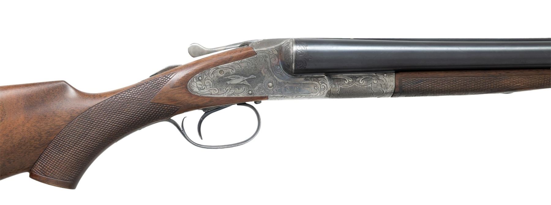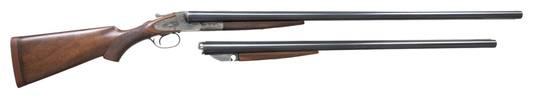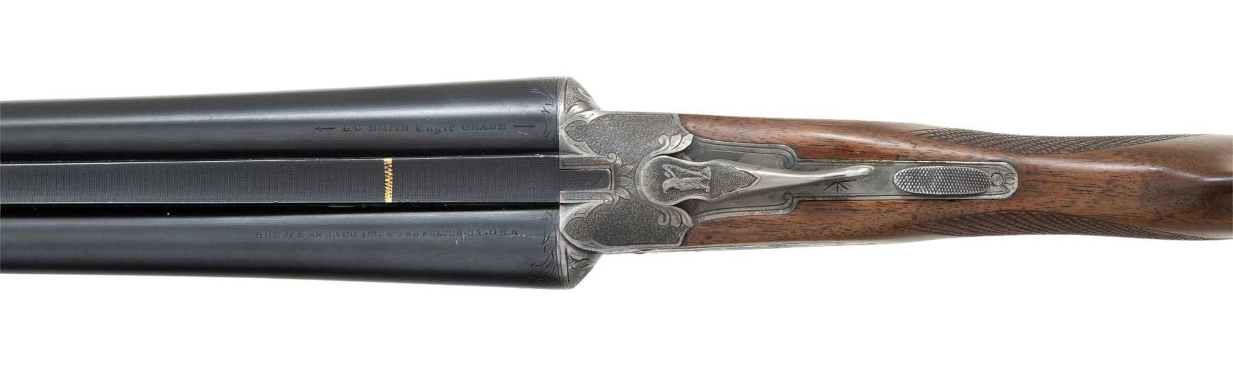 ADDED EXTRA BARREL SET. Cal. 12 GA, 2 5/8". S# RE79382. Bbl. 32" with fixed Full and Full chokes. Ivory front and mid beads. Right bbl. is marked "L.C. EAGLE GRADE". Concave rib has a gold band 2" forward of the breech. Case colored sidelock action has eagle grade engraving featuring a flying duck on the right lockplate with a flying pheasant on the left. Birds are surrounded by punch dot backgrounds with vine type foliate scroll bordering the lockplates, receiver, floorplate, trigger guard, and breech ends of bbls. Top and forward portion of receiver has additional punch dot engraving. Top lever is highlighted by a raised eagle. Hunter One single selective trigger. Selective ejectors. Non-automatic safety. Original ebony tipped checkered walnut splinter forearm. Replacement pistol grip walnut stock with coarse borderless hand checkering. LOP: 14 1/8" over a Decelerator pad. Bore Diameter: RT: .725, LT: .724. Choke Constriction: RT: .040 (Full), LT: .040 (Full). Weight: 8lbs. 0.4oz. Only 562 Eagle Grade shotguns in all gauges were mfg. 1912-1939. UNATTACHED ACCESSORIES: added set of Field grade bbls. S# 79382. Bbls. are 28" of Armor Steel. White front sight with ivory mid bead on concave game rib. Ejector bbls. have a matching number case colored forearm iron. Splinter hand checkered walnut forearm is a replacement. Top lever sits nicely right of center with extra bbls. in place. Bore Diameter: RT: .726, LT: .726. Choke Constriction: RT: .009 (Imp. Cyl.), LT: .022 (Mod.). This example is also accompanied by contemporary plastic snap caps. CONDITION: original bbls. retain over 80% lightly worn reblued finish showing spots of carry wear. Action retains small amounts of case colors in protected areas. Water table of action and both sets of bbls. have added owner identification markings. Trigger plate screw is an inappropriate replacement. Original forearm shows heavy finish and checkering wear with dents and marks having chips around the iron. Stock has hairline cracks extending from the lockplates with screw type repairs inserted on either side of the trigger plate. Action is tight with top lever sitting at center. Trigger and ejectors function properly. Good bright bores. Extra set of Field Grade bbls. retain over 80% lightly worn original blue with good bright bores. Forearm shows scratches and marks with iron retaining lightly visible case colors. (25-3212/DS). CURIO. $4,000-6,000.
