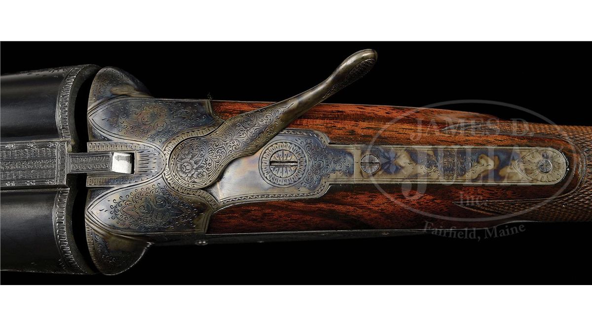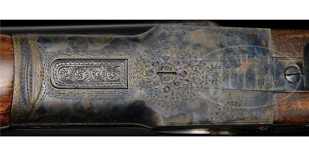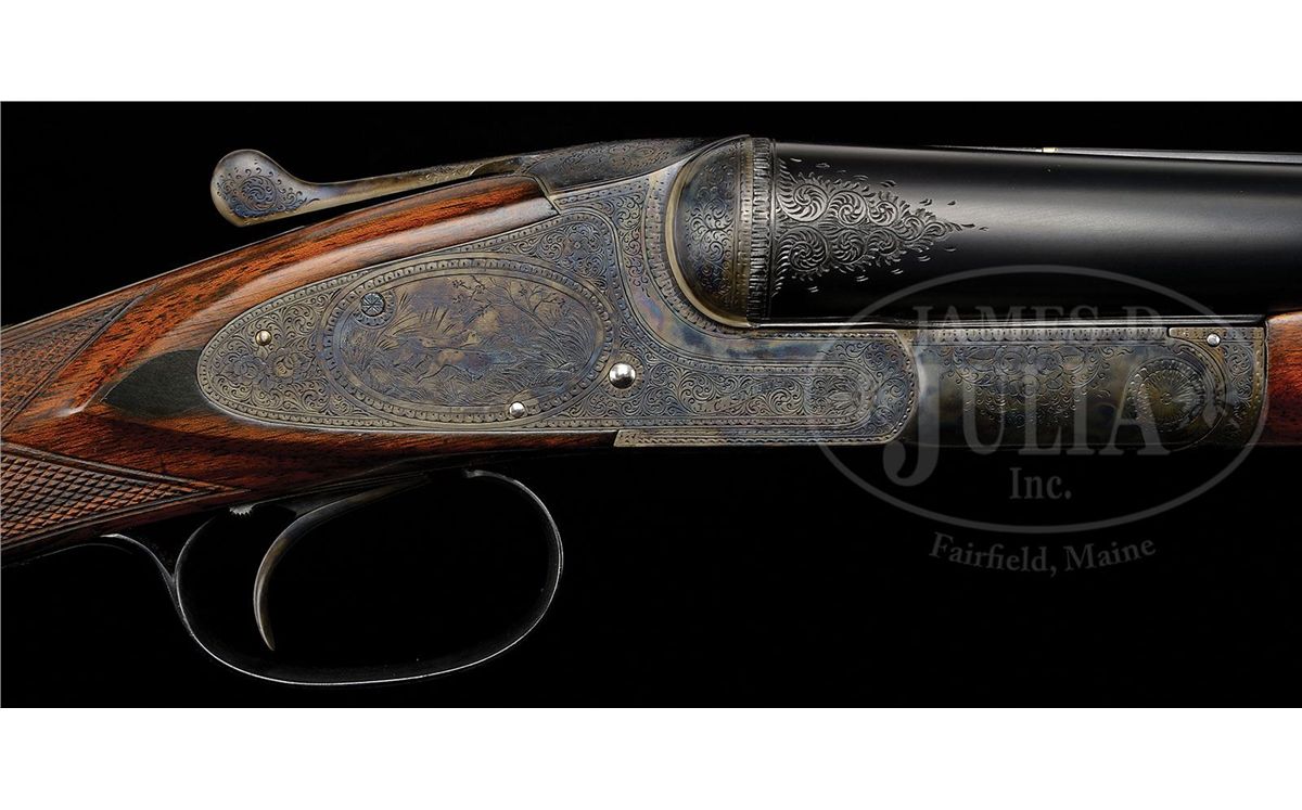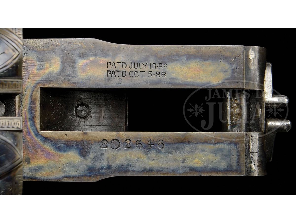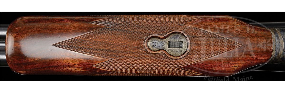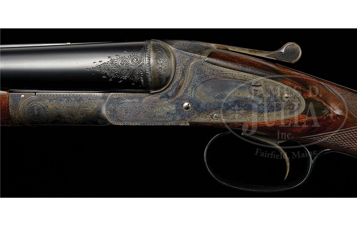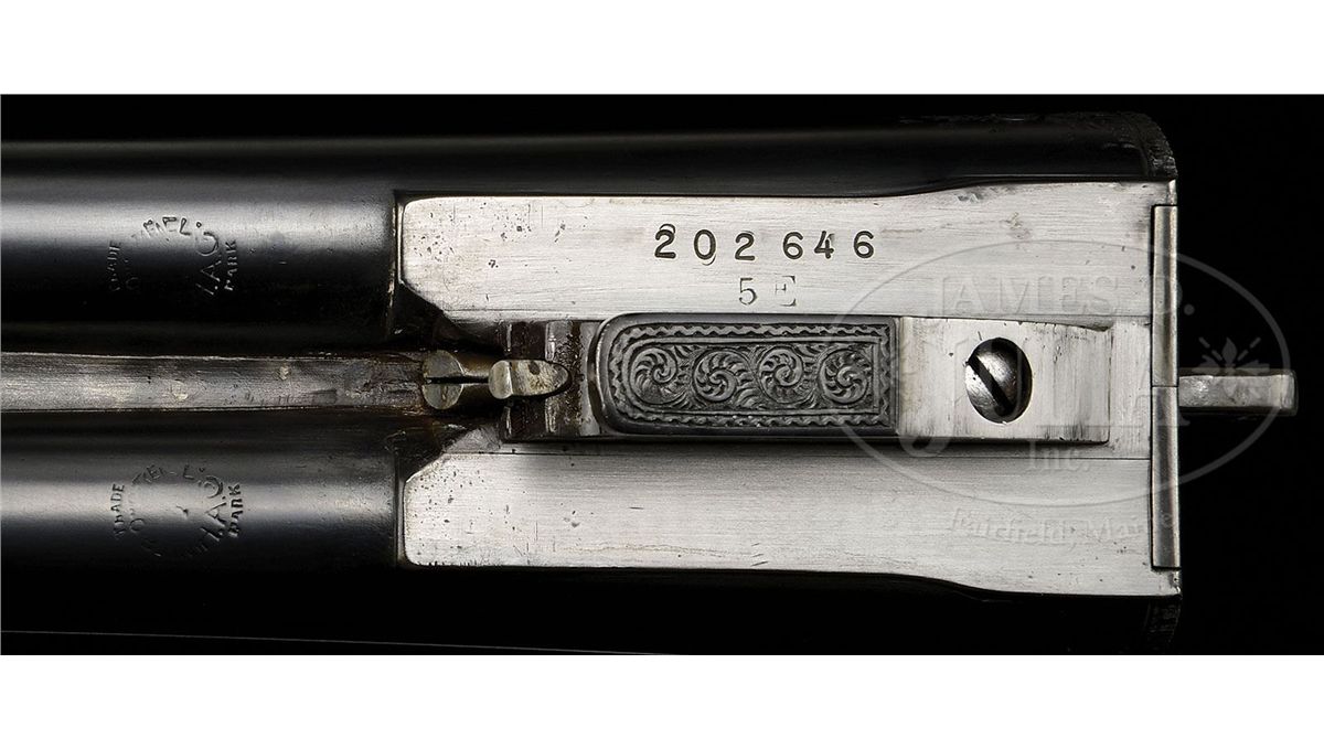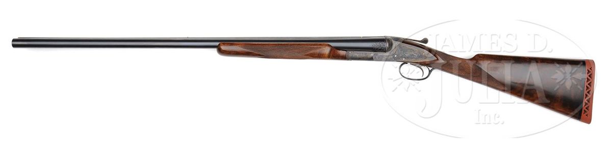 SN 202646. Cal. 12 ga. 2-3/4" Chambers. One of 373 5-E guns produced, this gun has 30" bbls engraved "MADE TO ORDER BY THE HUNTER ARMS CO. FULTON N.Y." on unmatted portion of concave game rib fitted with two ivory beads. Rib extension is heavily matted behind gold band divide. There are 1-1/4" triangles of scroll engraving at breech ends of bbls. Bbl flats are stamped with SN and grade. Typical case hardened regular weight action has never had a safety, and is fitted with Hunter single selective trigger. Action is engraved with about 80% coverage fine scroll with floral highlights, within geometric borders framing nicely detailed vignettes of hunting dogs in wooded backgrounds on each lockplate; a pair of setters, one pointing, the other honoring the point, on left plate, and with pointers in similar poses on right. Scroll engraved trigger guard has central oval on bow engraved "L. B. Murphy". SN is on long tang. Nicely figured American walnut straight grip buttstock measures 14" over open-sided red "Hawkins" pad. Point pattern checkering is at grip, and there are leaf shaped ebony inlays behind each lockplate. Beavertail ejector forend has brace added similar to that found on Model 21s. Bore diameter: left-.728, right -.727. Bore restrictions: left -.036 (Full), right -.032 (Full). Wall thickness: left -.023, right -.028. Drop at heel: 1-15/16", drop at comb: 1-3/8". Weight: 7 lbs. 15 oz. LOP: 14". PROVENANCE: Cody Firearms Museum letter with specifications of this gun, stating it was shipped on Jan. 13, 1904, and returned and repaired "Murphy Feb. 28, 1934". Plus what appears to be orig hang tag for this gun. CONDITION: Excellent, as refurbished. Bbls retain nearly all of a satin re-black, engraving picked up. Action retains essentially all of a dark color re-hardening. Buttstock retains essentially 98% of a heavy oil refinish, checkering re-cut. Pad is new. New forend retains nearly all of a similar finish. Bores are excellent. Action is tight. Ejectors are strong. Trigger works. 4-49373 MGM281