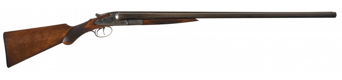 Manufactured in 1907. The barrels have a single brass bead sight, are choked .020/.035 and have 2 7/8 inch chambers with an extractor. The matching serial number is stamped on the water table, barrel flat and forearm hardware. Mounted on a multi-point checkered splinter walnut forearm and semi-pistol grip stock with serrated hard rubber buttplate.