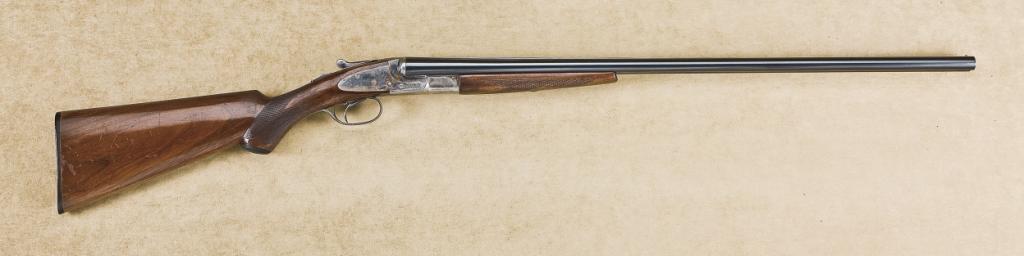 L.C. Smith 20ga field-grade double-barrel shotgun, field choked, factory 28” barrels, single factory trigger, auto ejectors, in very good plus to near fine original condition, serial number “155840”. The barrels retain 95% original blue, some slight thinning, a couple areas just beginng age. The frame shows 70-80% case hardening, evenly thinning and drifting on edges in front of frame with some very good rainbow colors still showing on the back three quarters and top of action. The standard grade wood stocks are good to very good with 60-70% evenly thinning varnish, some scratches, minor scrapes, etc. The trigger guard shows 60-80% thinning original blue. The stock is its original full length, with composite original buttplate. The action tight, bore is near excellent. Est.: $2,000-$4,000.