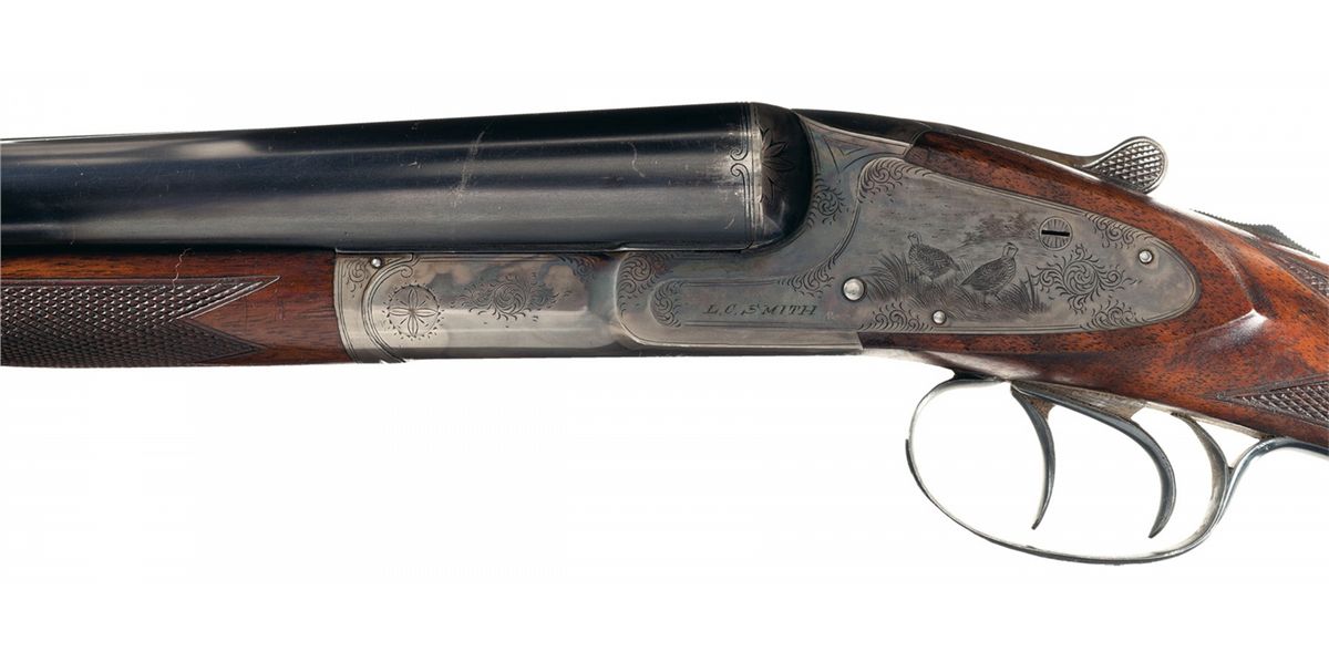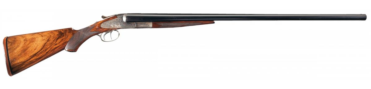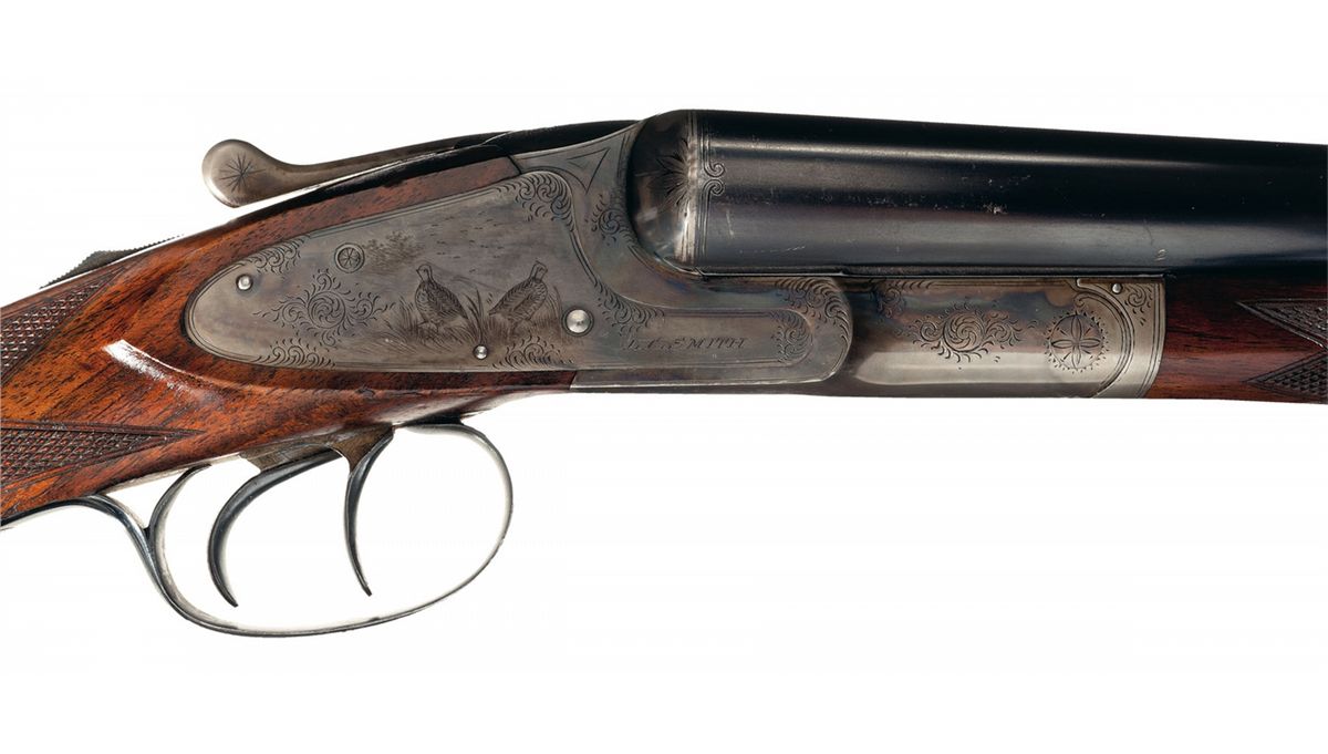 Manufactured in 1909, there is a white bead front sight, white mid bead sight, choked full/full and 2 3/4 inch chambers with ejectors. The top of the rib at the rear is engraved "HUNTER ARMS CO. FULTON, N.Y." and the bottom flat is marked with the serial number "212220" over "3E". The water table is marked "PAT'D JULY 13 86/PAT'D OCT 5 86" and with the serial number "212220". The right side plate is engraved with two quail in a field with flourishes of floral scroll and the left side plate is also engraved with two quail in a field. Mounted on a multi-point checkered walnut forearm with ebony tip and pistol grip stock with hard rubber grip cap and solid recoil pad. Length of pull is 13 1/2 inches.