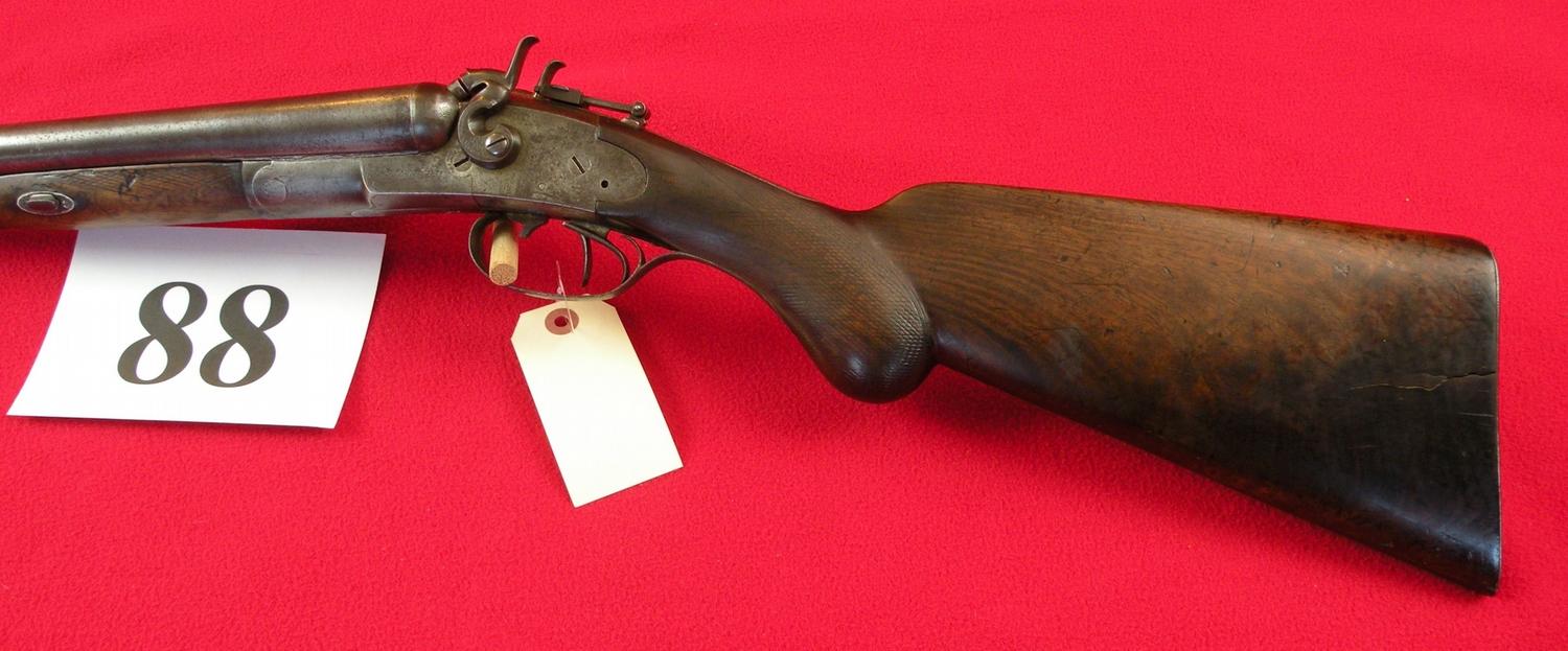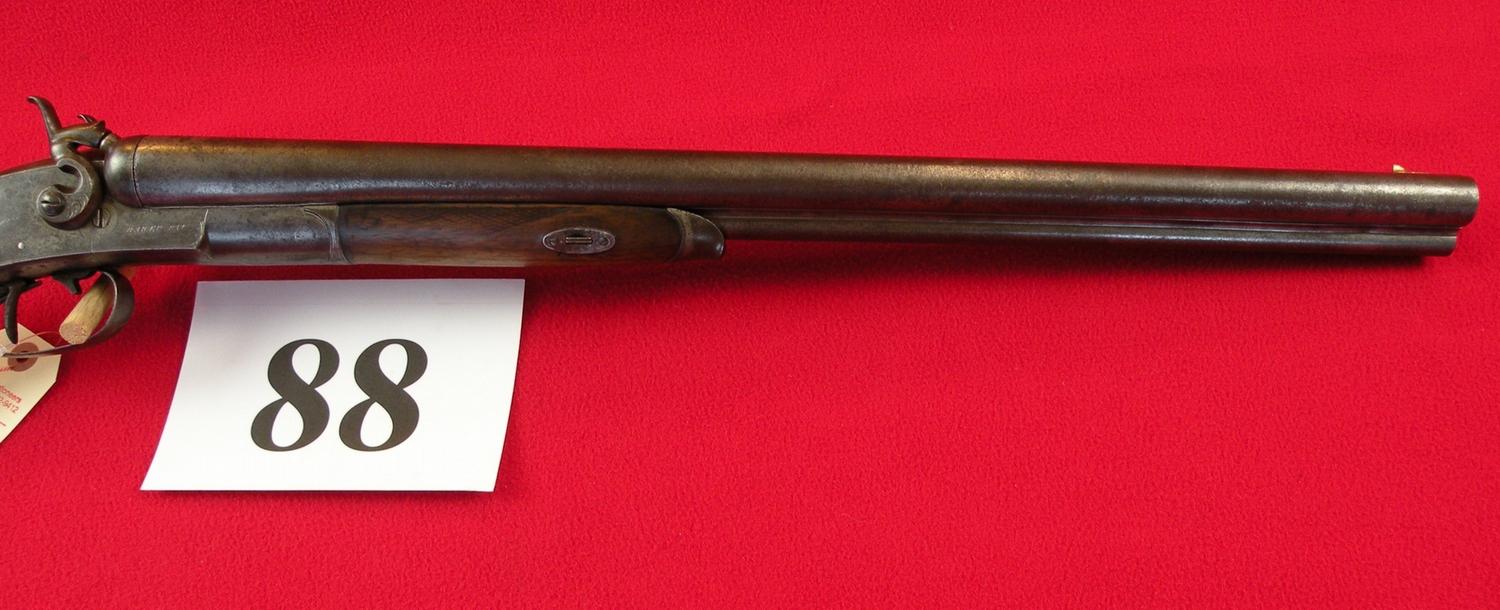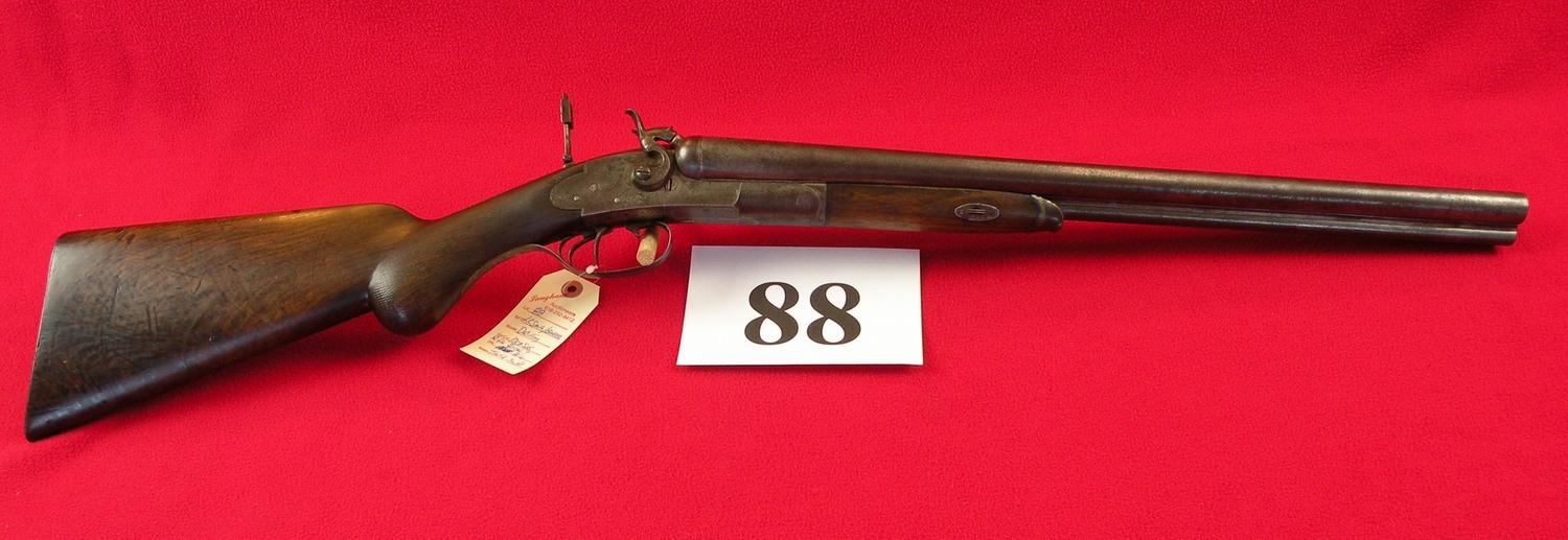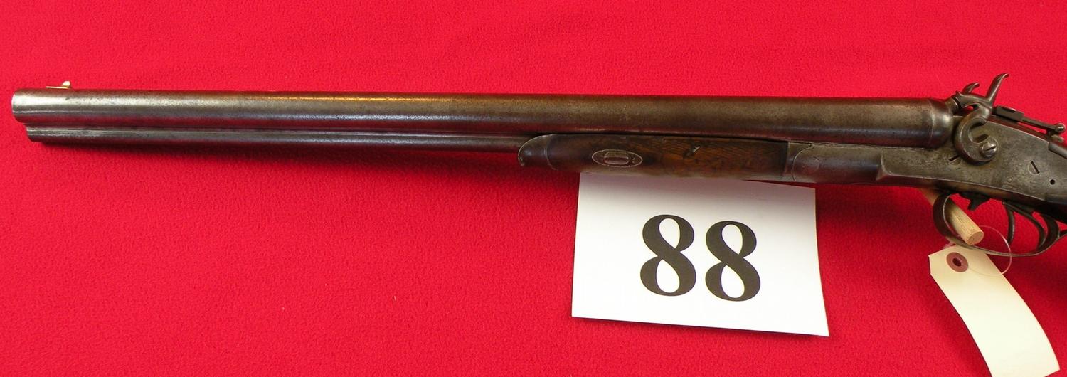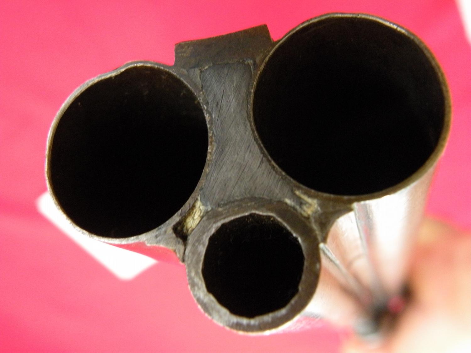 10 ga. With third barrel drilling 40 cal, 21 1/2" Damascus barrel, tang sight, interesting break open device (push trigger forward), made in 1880, SN 816