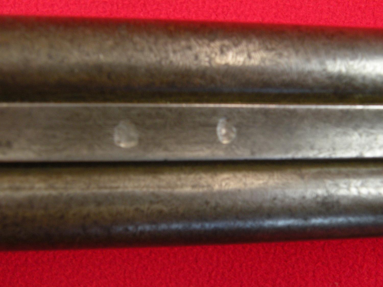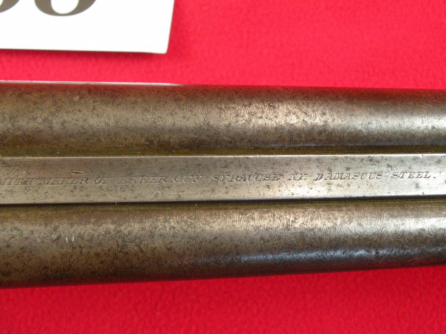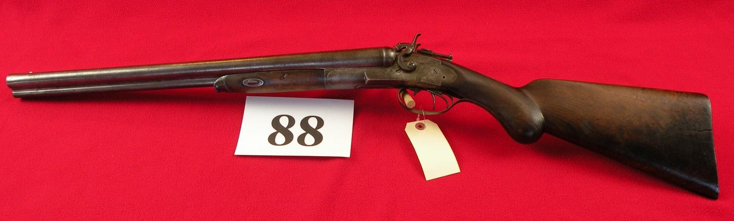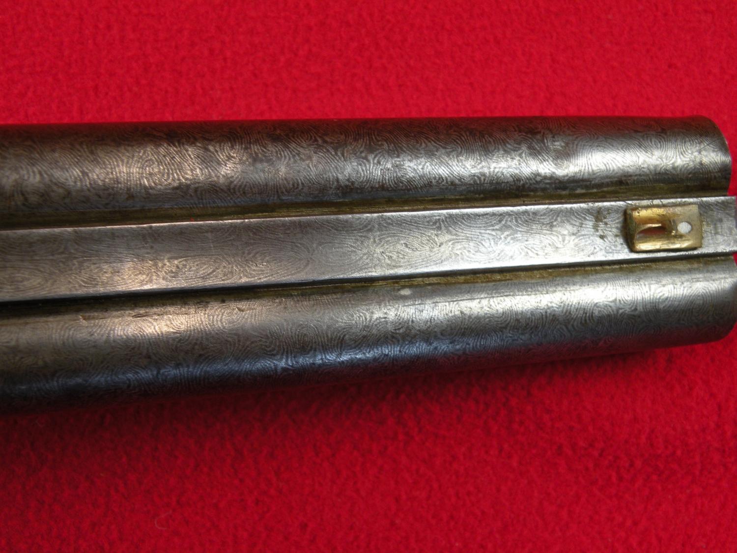 10 ga. With third barrel drilling 40 cal, 21 1/2" Damascus barrel, tang sight, interesting break open device (push trigger forward), made in 1880, SN 816