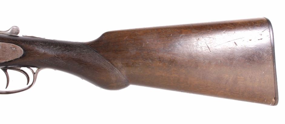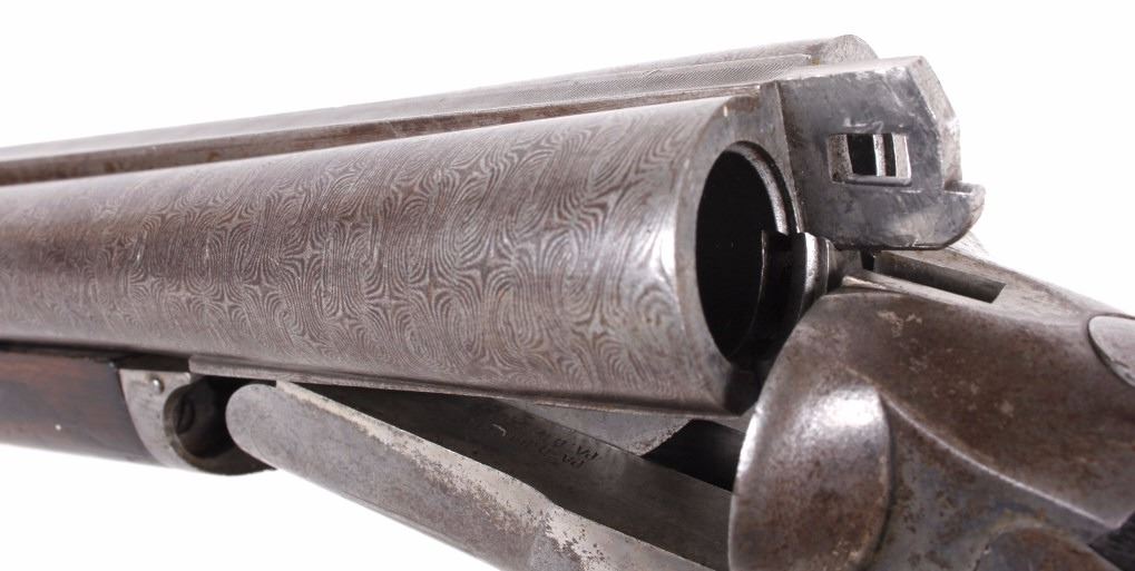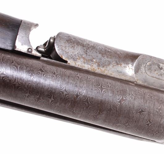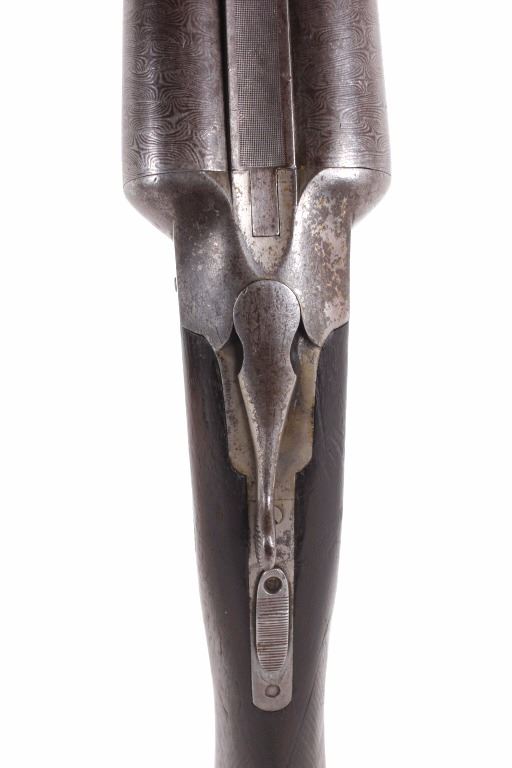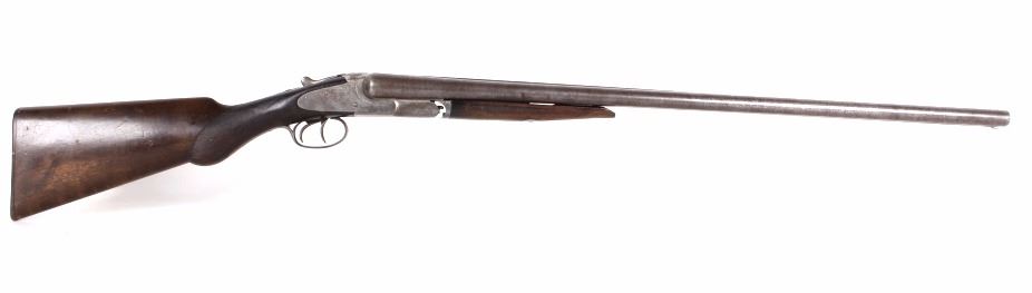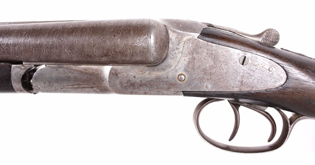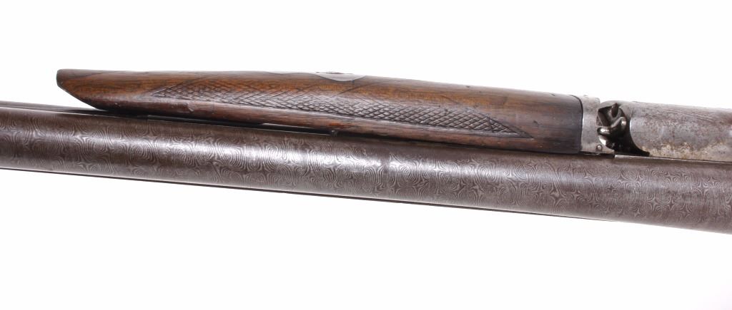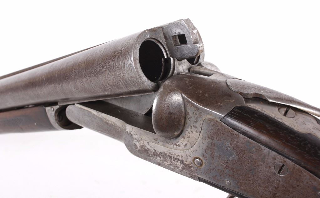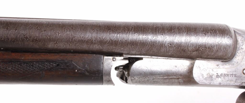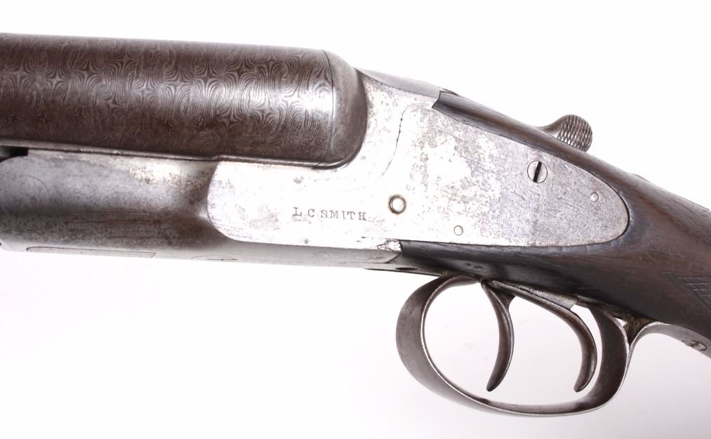 This lot features a L.C. Smith side by side double trigger 12 GA shotgun with Damascus steel barrels. Manufactured during the mid 1800s L.C Smith was one of a few British manufactures with the technical skill to produced a hammerless side by side with a sidelock. This shotgun is beautifully crafted with its Damascus steel barrels. The gun does show signs of age and wear. The barrel under rib is delaminating. The fore grip lug also does not fully attach to the breach and is sliding. Overall, however, the gun is still in fair condition. Does not appear to be firing. Serial numbers:202170 Curio Relic shotgun FFL or NCIS background check required.