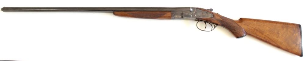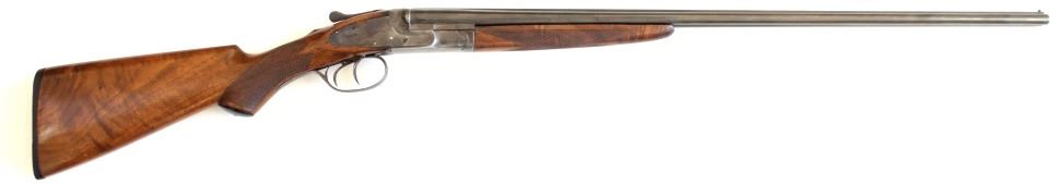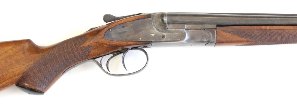L.C. Smith Featherweight Field Grade .410 SN 105018 SXS shotgun made in 1927. Equipped with ejectors, double trigger, solid matte rib barrels, single gold bead sight and American walnut checkered pistol grips stocks. Barrels 27 1/8" unmarked to the top,SN 105018 SXS shotgun made in 1927. Equipped with ejectors, double trigger, solid matte rib barrels, single gold bead sight and American walnut checkered pistol grips stocks. Barrels 27 1/8" unmarked to the top, bottom of flats show 2 serial numbers 167269 and larger 105018, choked full on right and skeet on left. Finish is mixture of blue drifting to plum and appears to have had an old coat of cold blue wiped over it at some pint. Actions and safety function the frame shows amostly old cleaned silver gray, top of tang around the safety a deep brown as does trigger guard. Sidelock plates are both stamped L.C. Smith and display case colors stronger on left side. Length of pull on pistol grip stock is 13 3/4" from front trigger, both with factory checkering with no chips cracks or repairs, matching serial on forend, black plastic pistol grip cap and buttplate are intact. A scarce little .410 that's seen a lot of use but only 2509 made. From old St. Louis collection. FFL / Modern. Est. 1500-3000
