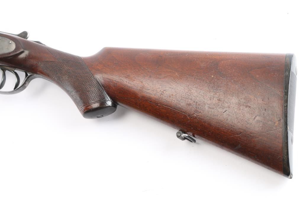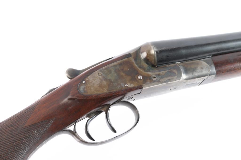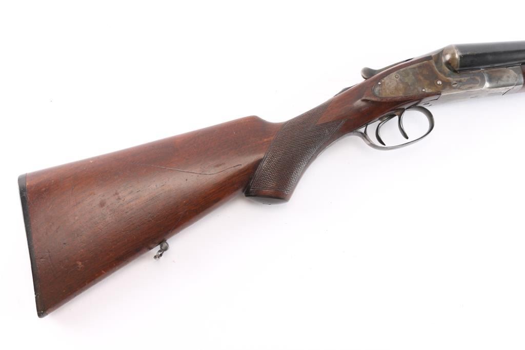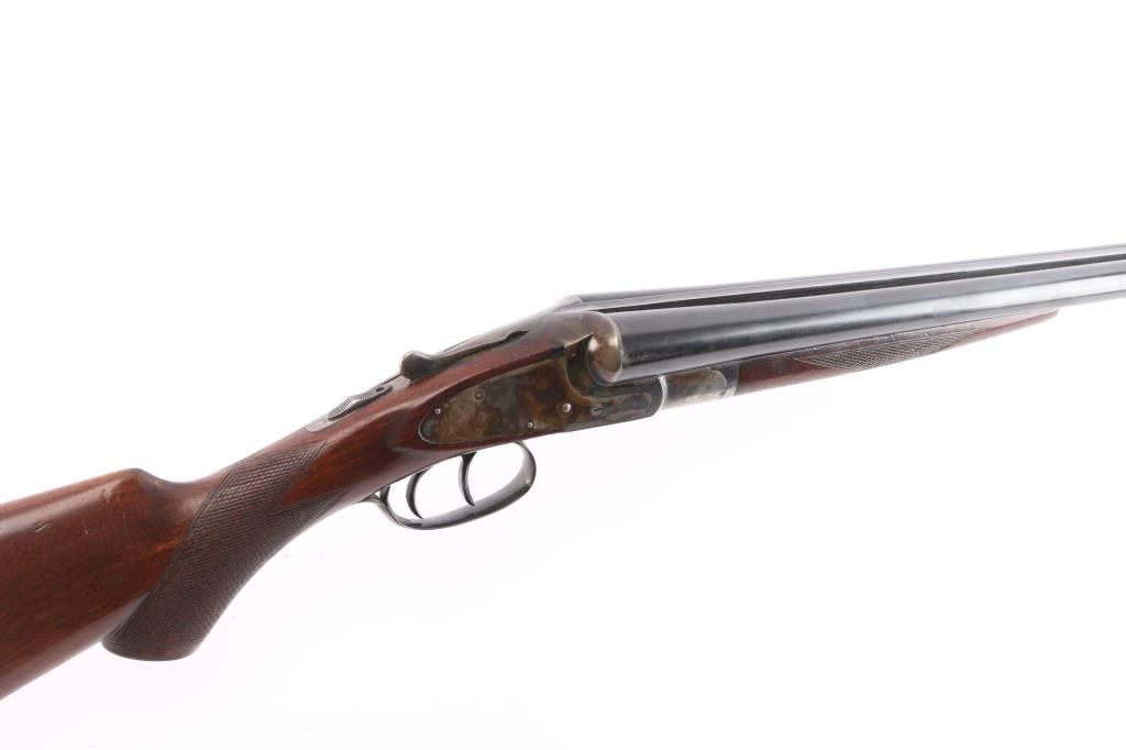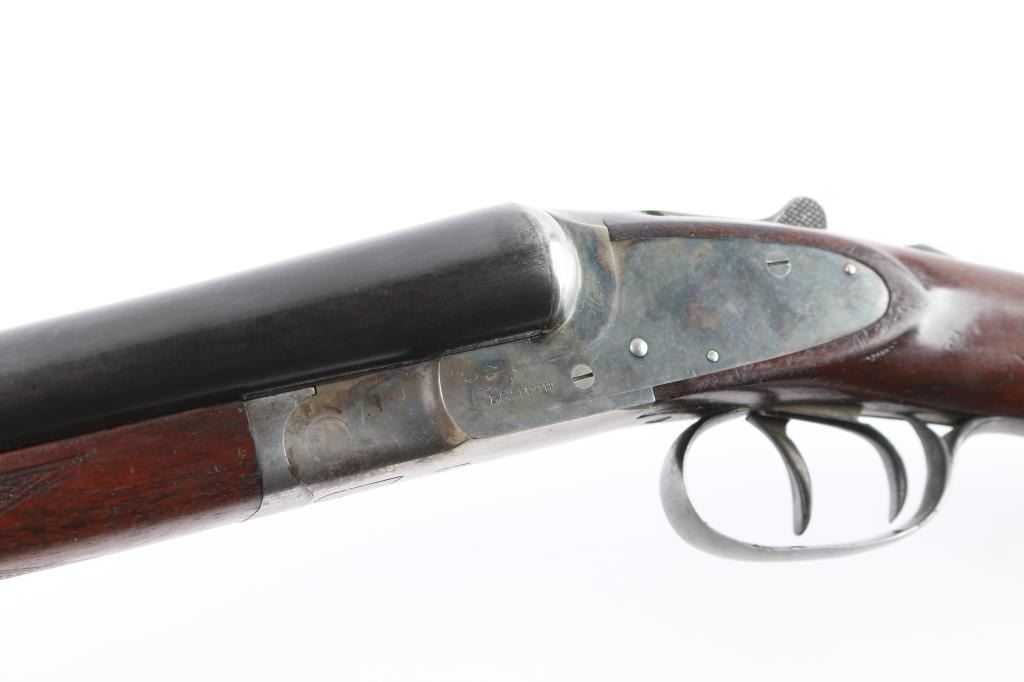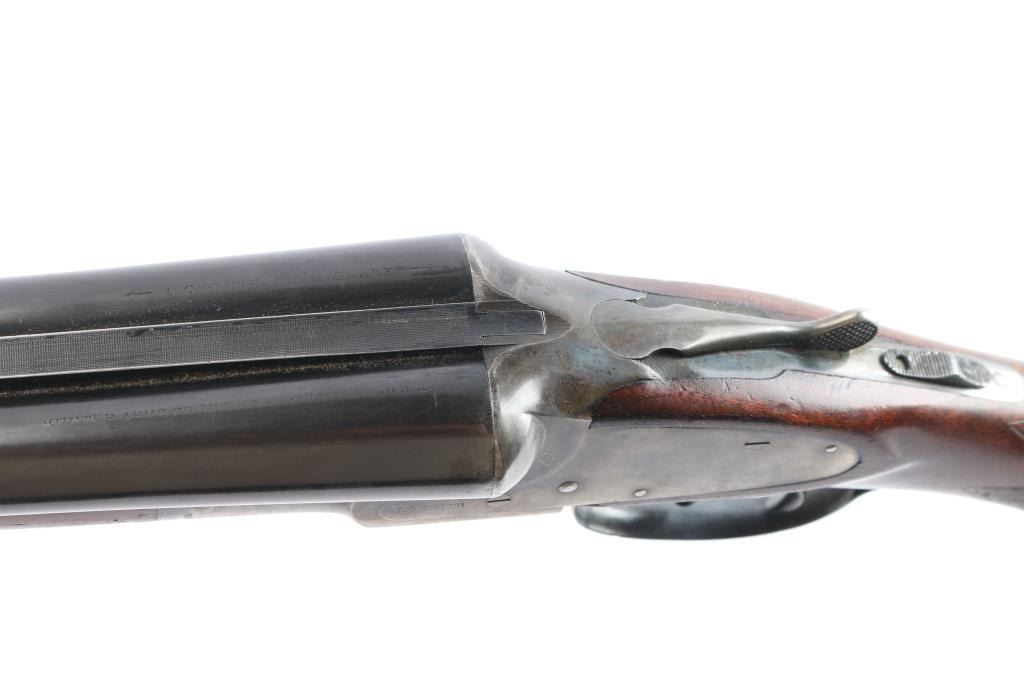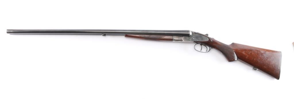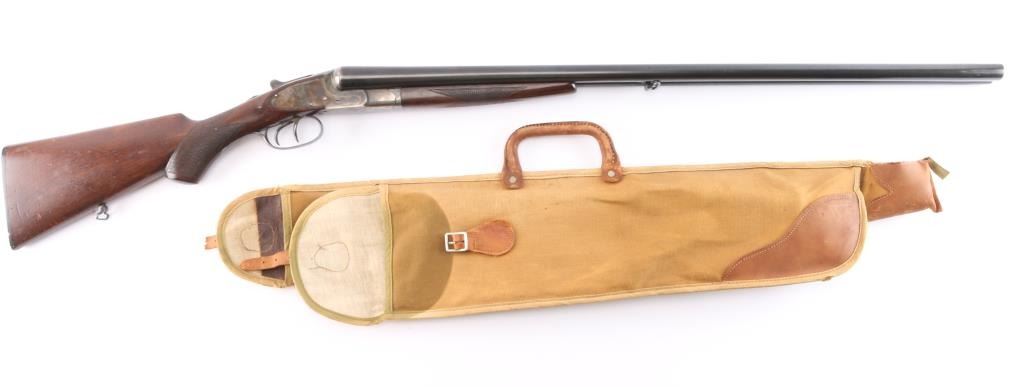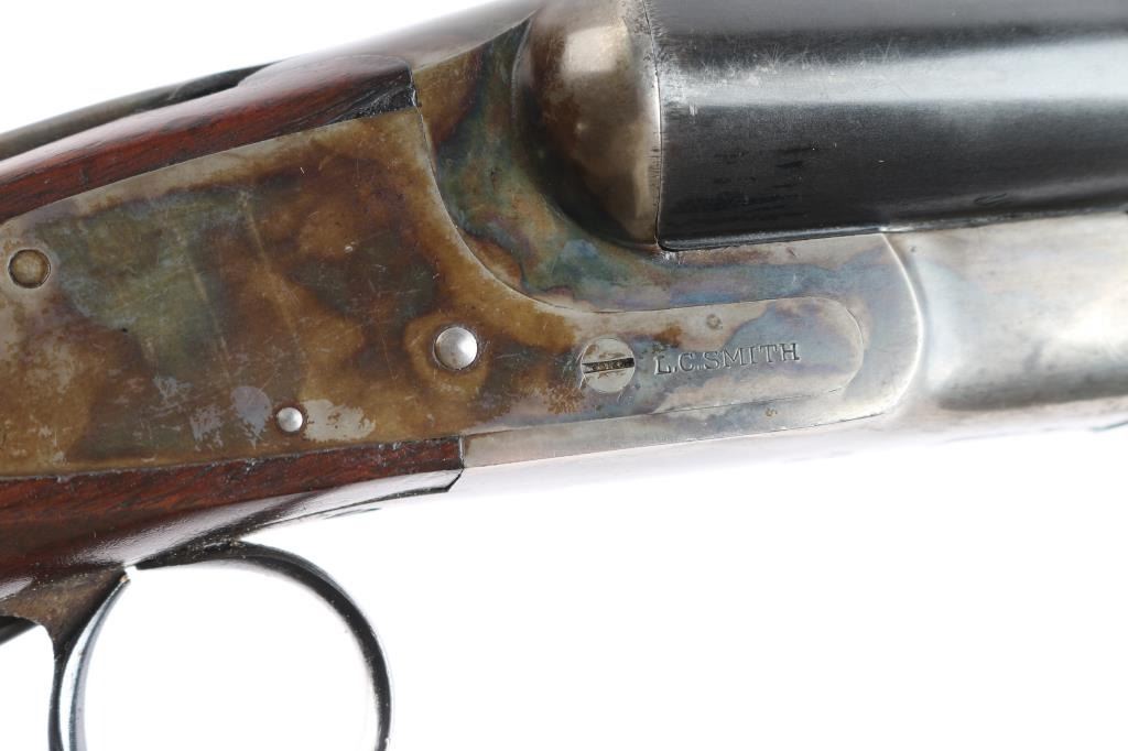 Vintage side-by side double barrel sidelock shotgun chambered for 12 gauge shells, manufactured circa 1921. Locks marked "L.C. Smith, right barrel marked "L.C. Smith Field Grade", left marked "Fulton Arms Co. Inc. M'F'R'S. Fulton NY U.S.A."Features blued 30" Armor steel barrels with raised solid rib, extractor, brass bead front sight, case hardened receiver, double triggers, sling swivels, sliding tang safety, knurled top lever, smooth walnut splinter forend and semi-pistol grip shoulder stock with black grip cap, serrated hard rubber buttplate & 13 3/4" LOP. Matching serial numbers on the receiver, barrels & forend metal. The barrels have an old reblued finish. The barrels retain about 95% of the reblue with minor edge/muzzle wear. The receiver exhibits faint case colors. Action is crisp, the bores are bright, markings are sharp and the refinished wood stocks are good with some scratches/dings. Bores measure left-Full, Right-IM. Comes with a Vintage Canvas And Leather Case For Takedown Gun. Overall good with seam separation at the top of the barrel compartment.