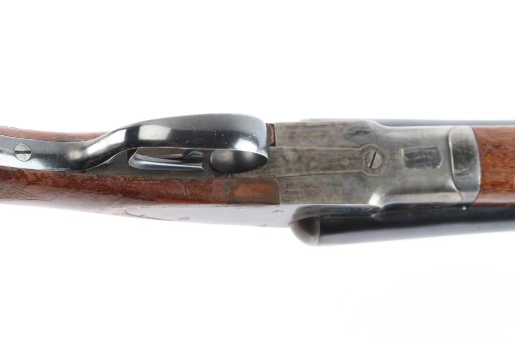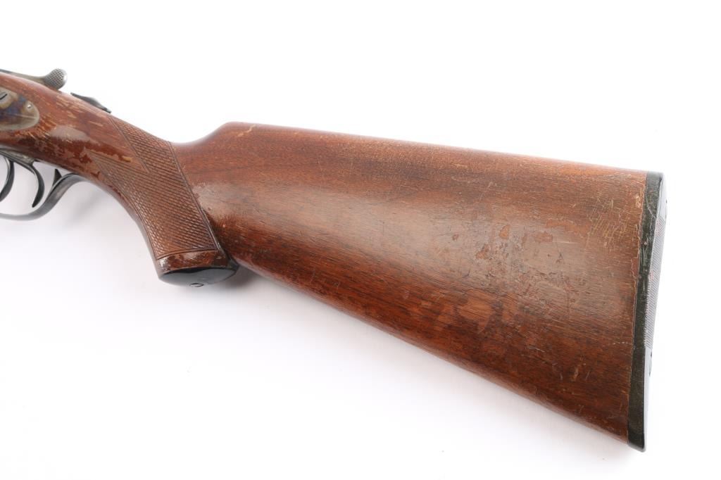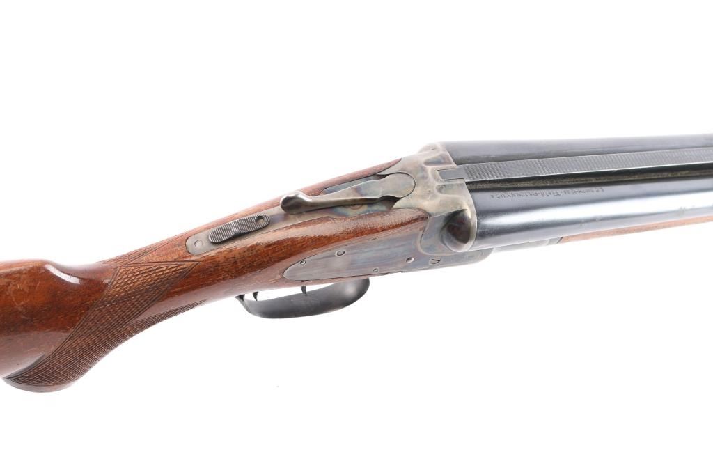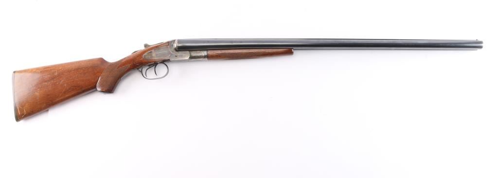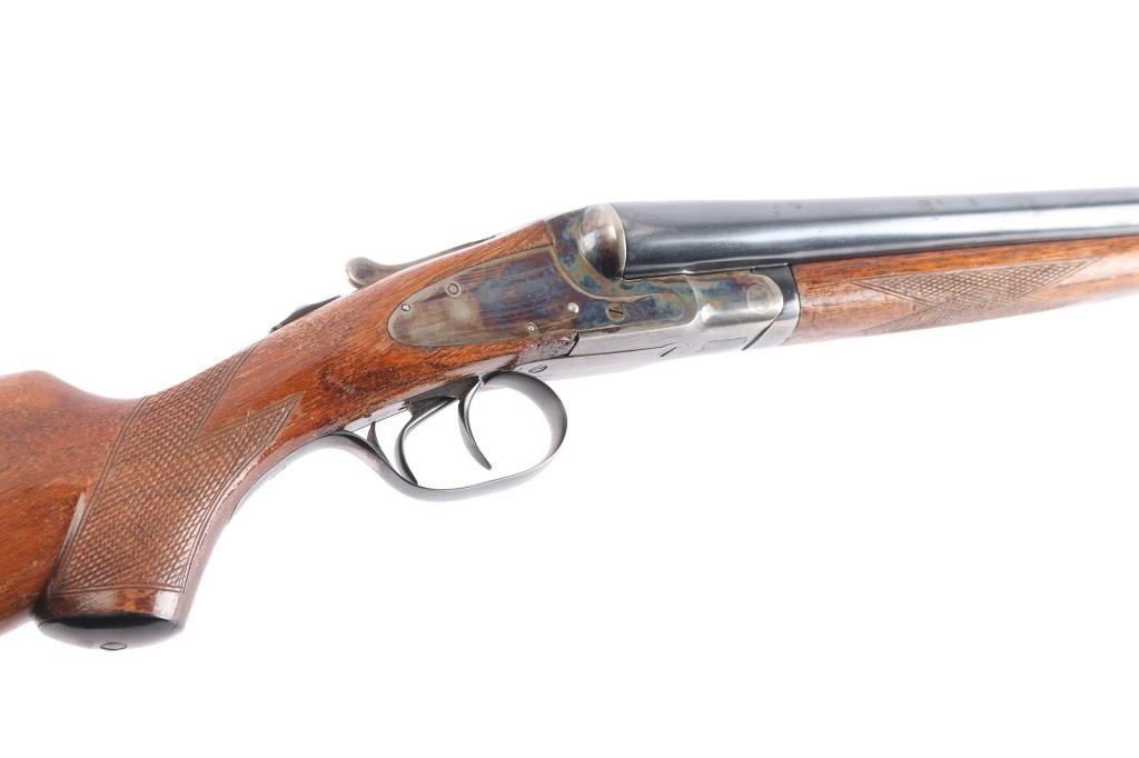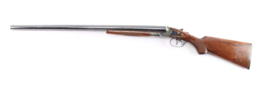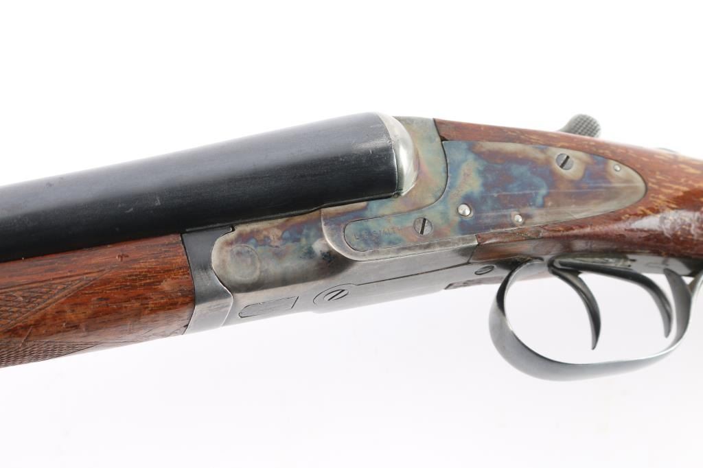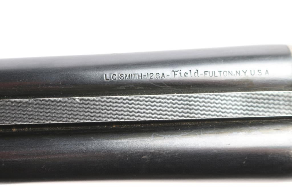 "featherweight" Double barrel side lock shotgun marked "L.C. Smith" on side plates, manufactured circa 1912-1950. Features 28" blued "Armor Steel" barrels (choked IM/Full), right barrel marked "L.C. Smith-12 Ga.-Field-Fulton, NY", matching serial number on watertable and barrels, watertable and barrels also stamped "Field" and "FW" (featherweight) low matted rib with brass bead front sight, case color action with removable side plates, double triggers, tang safety, top lever, single extractor, walnut stocks with smooth splinter forend & semi-pistol gripped shoulder stock, smooth black plastic or composition grip cap, unmarked smooth black plastic or composition buttplate. Shotgun has been professionally restored. Bores are very good. Retains about 94% original blued finish on barrels, with a couple of spots of light pitting on the lower right barrel, some muzzle/handling wear. original casehardened action is about 90% with handling loss on the tang, bottom metal. Wood is overall very good, no cracks, some scratches, scuffs and finish loss, mostly to the shoulder stock LOP is 14"' to the front trigger. FWS prefix 1946-1950.