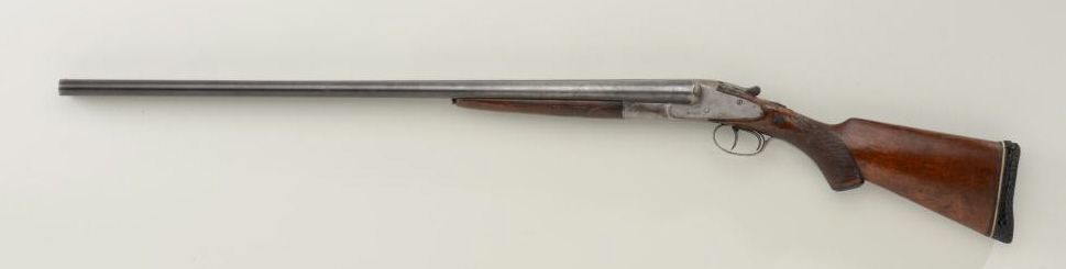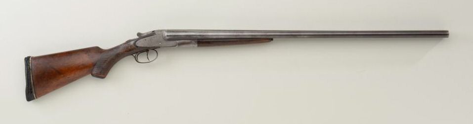 L.C. Smith Field Grade/Hunter Arms Co. SxS shotgun, 12 gauge, 30” barrels, blue and case hardened finish, checkered wood stocks, #341494. This is a good gun for a restoration project as the barrels are overall good with good bores and the receiver shows traces of case colors in protected areas with balance gone to a silvery tone; rear trigger is not working, front trigger crisp; butt stock poorly repaired at wrist with deterioratedbutt pad. Est.: $150-$300.