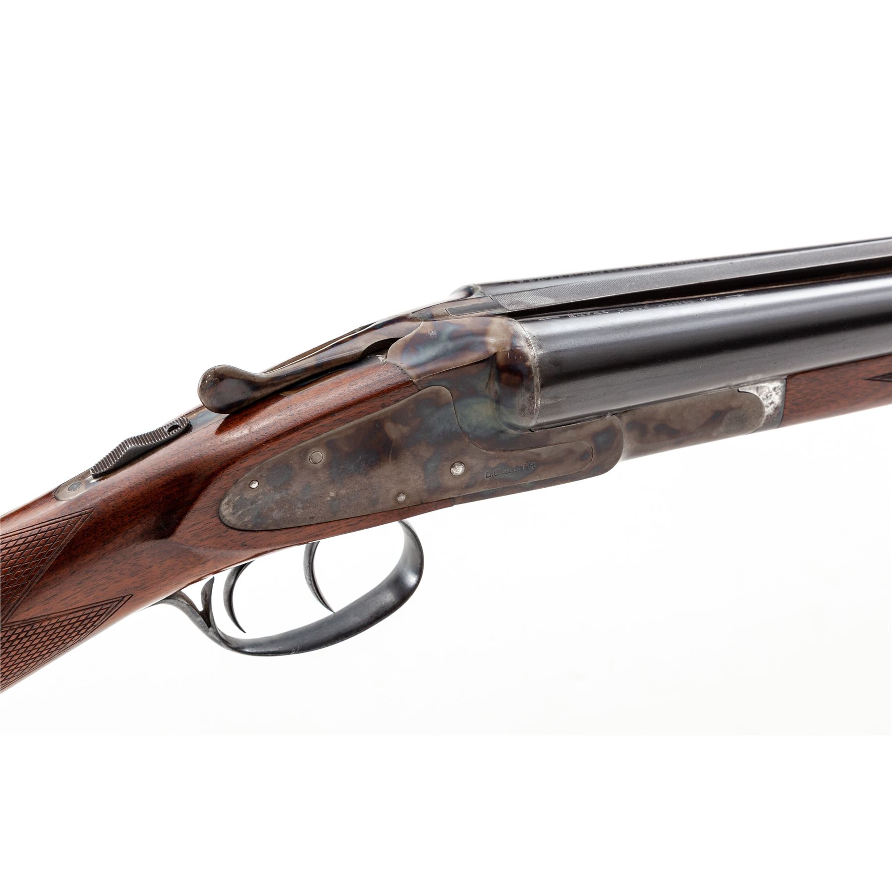 L.C. Smith Field Grade Side-by-Side Shotgun, #R97351. 12 ga. 30'' ''Armor Steel'' barrels have 2-3/4'' chambers and are choked Full/Full. Sidelock action features double triggers, auto safety and standard extractors. Splinter forend and straight grip buttstock are Standard Grade walnut with field checkering; buttplate is black plastic. Mfg'd 1927. Condition is very good with 70%-80% case color, some edge and carry wear and light frosting. Approx. 95% blue remains on barrels with some corrosion removal at breech and muzzle, and numerous small handling marks on wood. Action locks tight, bores are bright. Est.: $750-$1,200. (C&R)