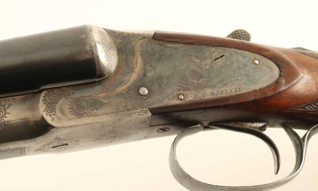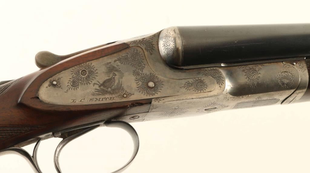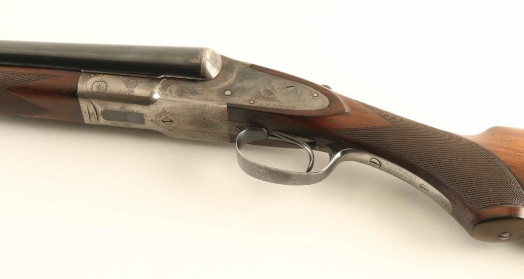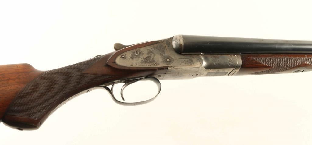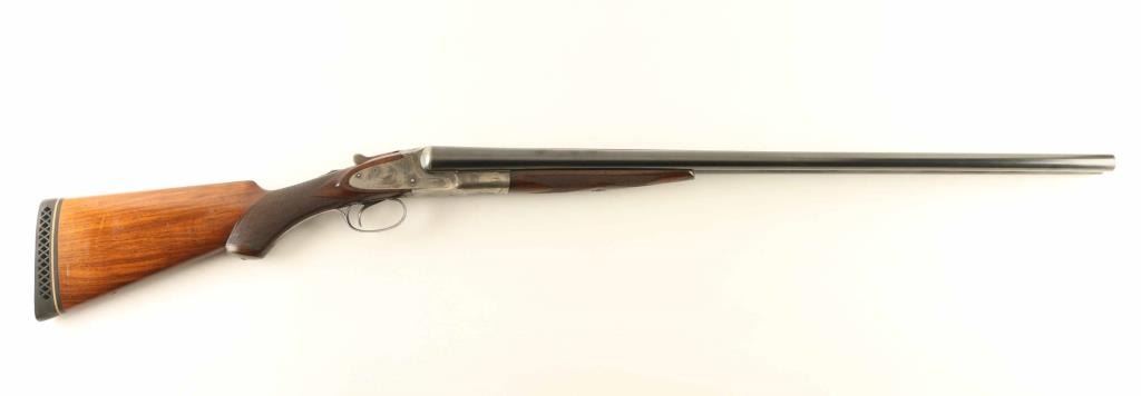 High quality American made side-by-side double barrel sidelock shotgun. Features 30" barrels with solid matted rib & Hunter Arms barrel address, choked Full & IM, extractor, single trigger with selector switch, ivory front & mid beads, case hardened receiver with engraved scroll patterns, checkered top lever, sliding tang safety, splinter forend with ebony diamond shaped inset tip, and hand checkered walnut semi-pistol grip shoulder stock with brown composition grip cap, Ventilated rubber recoil pad & 13 3/8" LOP. Numbers match on water table, barrels, forend iron. Bores are very good condition. Barrels retain 90% blue, with nicks & scratches. Case color action is very good condition, slightly faded. Wood is very good condition, fairly sharp points on checkering, slight puckering around side plates from prying off. Recoil pad is hard, inflexible. Hole in butt on toe line from removed sling stud. Bottom rib also shows removed swivel, leaving two holes and small remnant of epoxy or similar material several inches forward of forend. Condition is NRA Very Good *** C&R Firearm ***