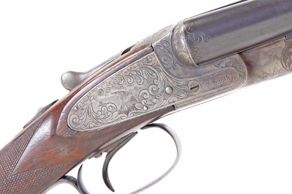 L.C.Smith/Hunter Specialty Grade 12 ga SN:FWE42777, Especially nice double barrel Specialty Grade shotgun. Blued barrels, receiver very nicely engraved and silver finished with duck and grouse scenes and with cross bolt and auto ejectors. Single seleSN:FWE42777, Especially nice double barrel Specialty Grade shotgun. Blued barrels, receiver very nicely engraved and silver finished with duck and grouse scenes and with cross bolt and auto ejectors. Single selective trigger. Excellentwalnut checkered pistol grip stock and forearm with wood extension expertly done including a new rubber butt pad. 30" barrels with good bores and action. Condition: Excellent showing no wear. A beautiful collector piece.