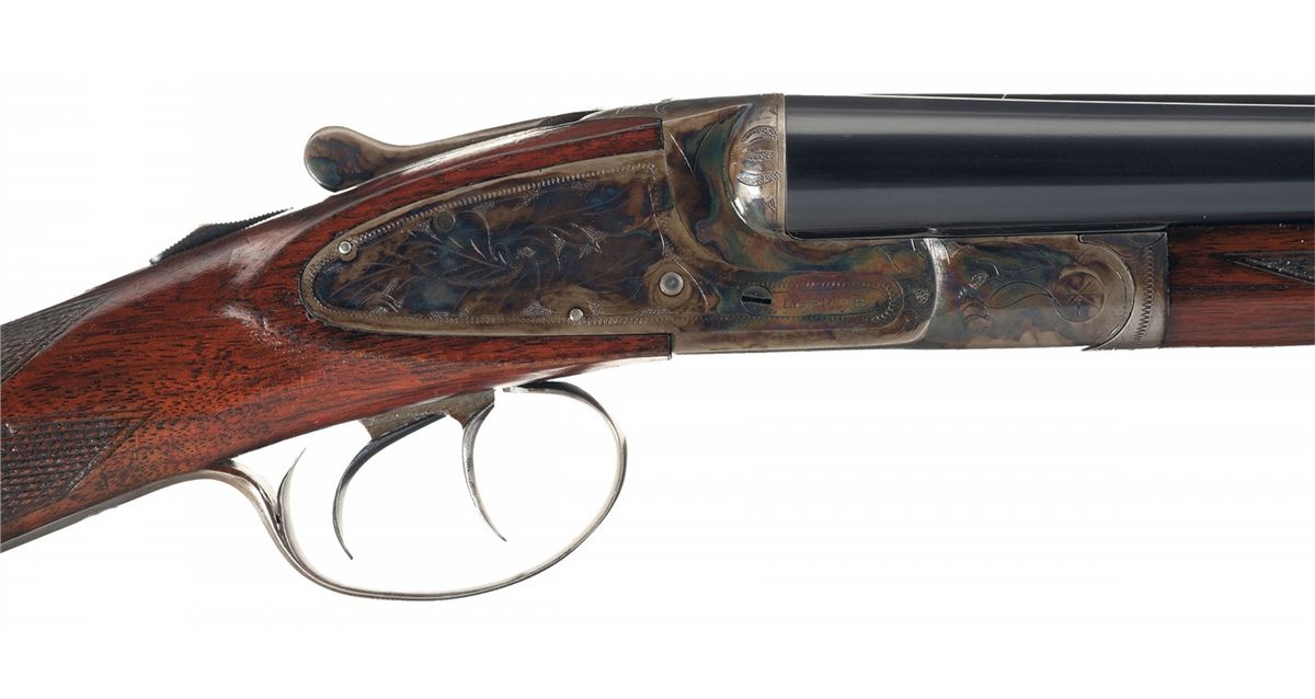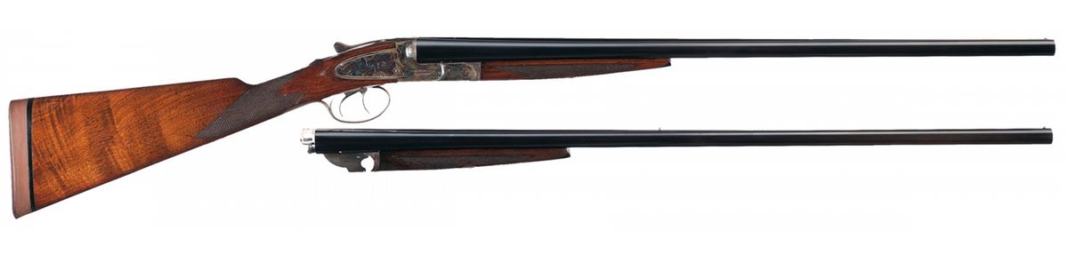 Manufactured in 1925. Single brass bead sight on the concave solid matte rib, choked cylinder/modified, 2 1/2 inch chambers with lengthened forcing cones and extractor. The Ideal Grade was the most economical hand engraved shotgun and has oak leaf designs on the side plates. Mounted on a multi-point checkered walnut forearm with ebony tip and straight grip stock with Pachmayr recoil pad. Length of pull is 13 1/2 inches. With an extra forearm and set of 30 inch barrels renumbered to match the gun with a white bead front and steel mid bead. Choked improved modified/improved modified with 2 3/4 inch chambers and ejectors.