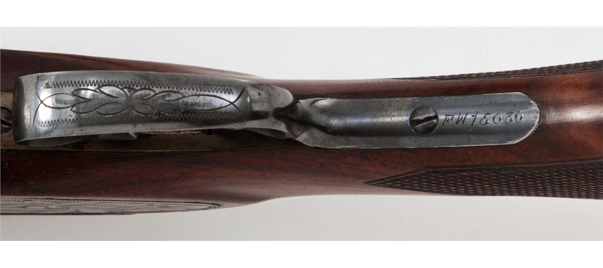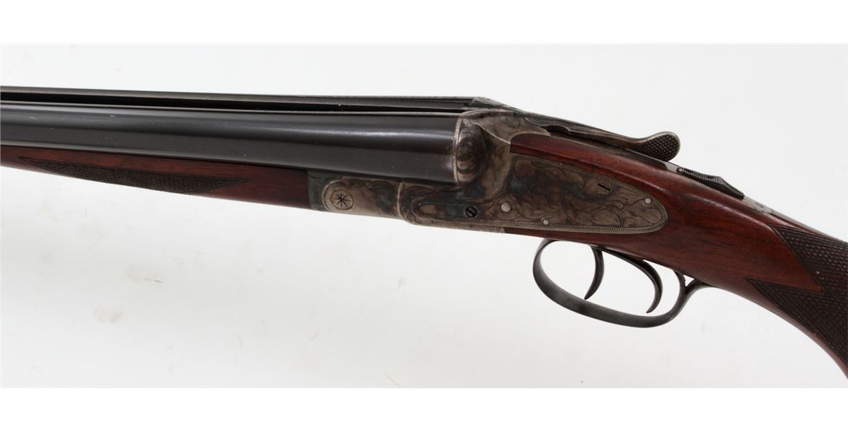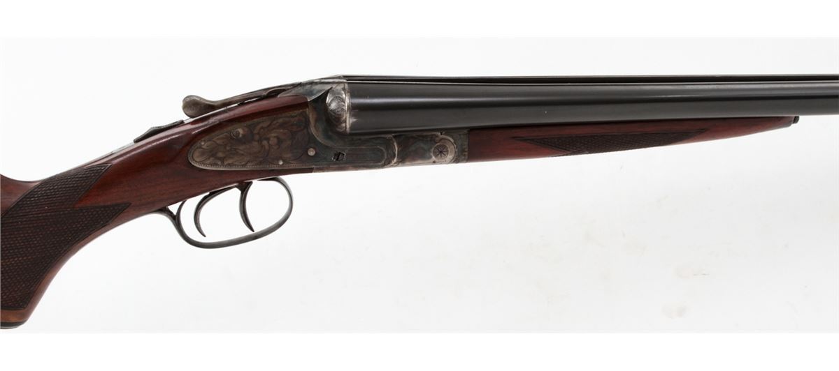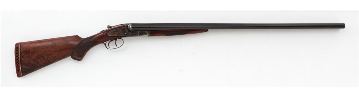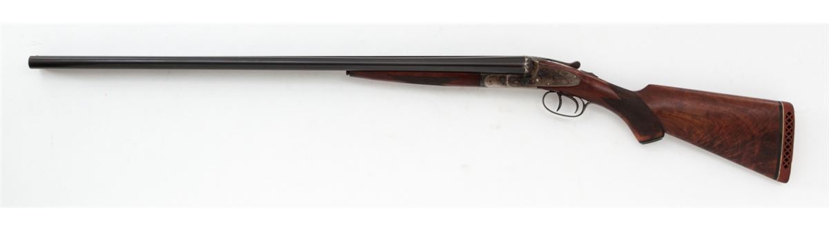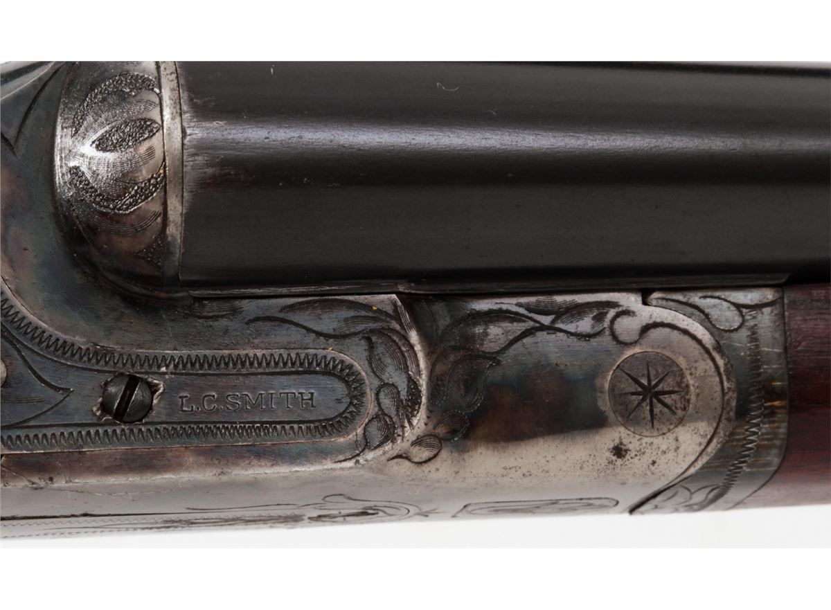 L.C. Smith Ideal Grade Side-by-Side Shotgun, #FW15030, 12 ga., 2-1/2'', blue finish 30'' barrels with concave matted rib and front brass bead, IM./Mod. Chokes, extractor, double triggers with manual sliding top tang safety (not working), lacquered case colored frame with standard Ideal Grade oak leaf engraving pattern. Pistol-grip stock and splinter forend are flame-figured American walnut with a length of pull of 13-3/4'' over a 7/8'' Goodwear red ventilated recoil pad. Mfg'd ca. 1919. Overall condition remains fair with 90% barrel blue and 75% case colors, bores are bright, left barrel has a scratch and dent 9'' from the muzzle and scratches in front of forend release, screw heads are marred, frame and sideplates have small contact indentations with right sideplate peeled around the retaining screw, triggers have moisture pitting. Wood has a blended split repair along the right side of the upper tang, forend edges have splits and pry marks at the release, buttstock revarnish is worn; safety mechanism requires repair. Est.: $500-$800. (C&R)