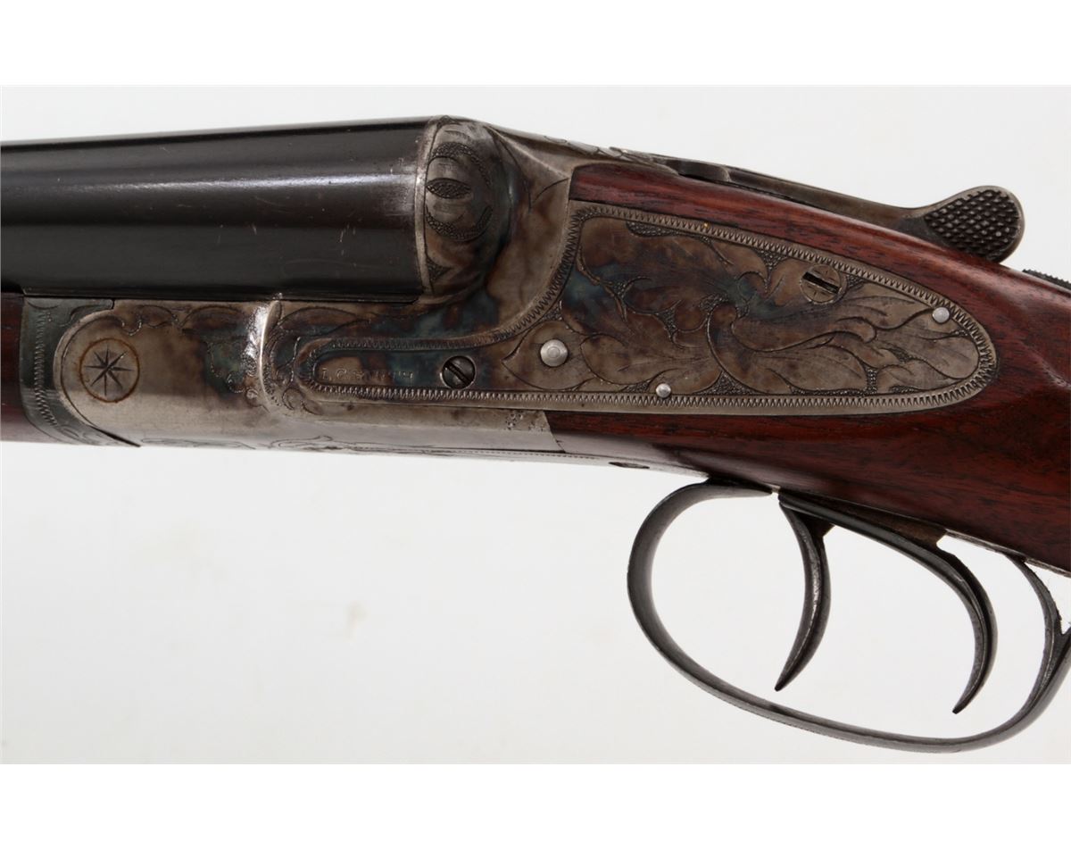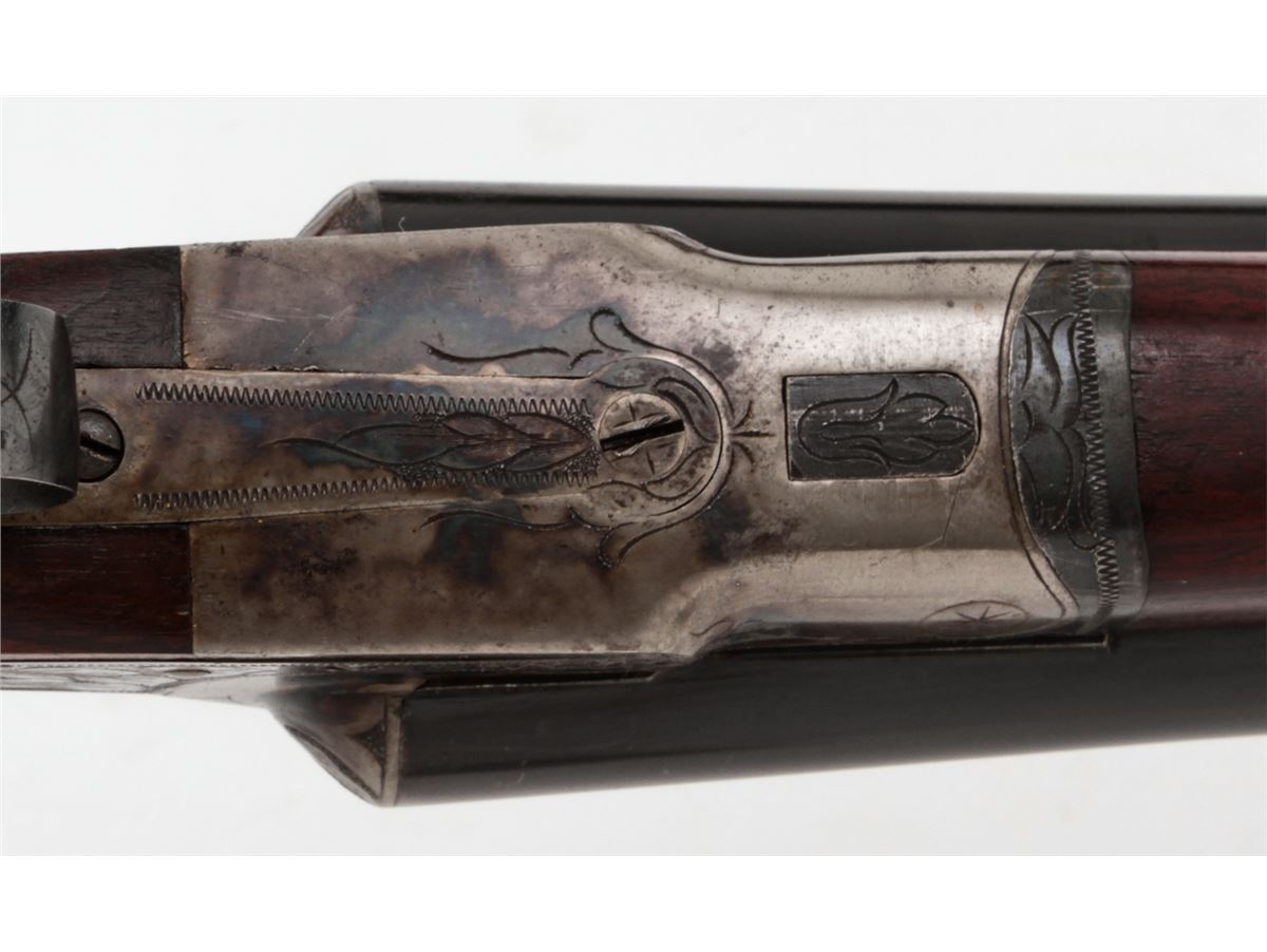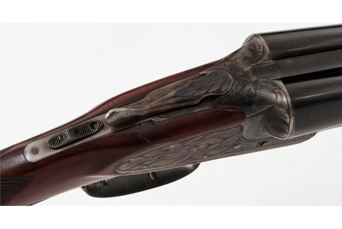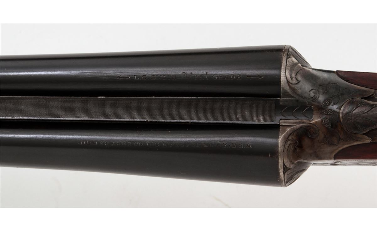 L.C. Smith Ideal Grade Side-by-Side Shotgun, #FW15030, 12 ga., 2-1/2'', blue finish 30'' barrels with concave matted rib and front brass bead, IM./Mod. Chokes, extractor, double triggers with manual sliding top tang safety (not working), lacquered case colored frame with standard Ideal Grade oak leaf engraving pattern. Pistol-grip stock and splinter forend are flame-figured American walnut with a length of pull of 13-3/4'' over a 7/8'' Goodwear red ventilated recoil pad. Mfg'd ca. 1919. Overall condition remains fair with 90% barrel blue and 75% case colors, bores are bright, left barrel has a scratch and dent 9'' from the muzzle and scratches in front of forend release, screw heads are marred, frame and sideplates have small contact indentations with right sideplate peeled around the retaining screw, triggers have moisture pitting. Wood has a blended split repair along the right side of the upper tang, forend edges have splits and pry marks at the release, buttstock revarnish is worn; safety mechanism requires repair. Est.: $500-$800. (C&R)
