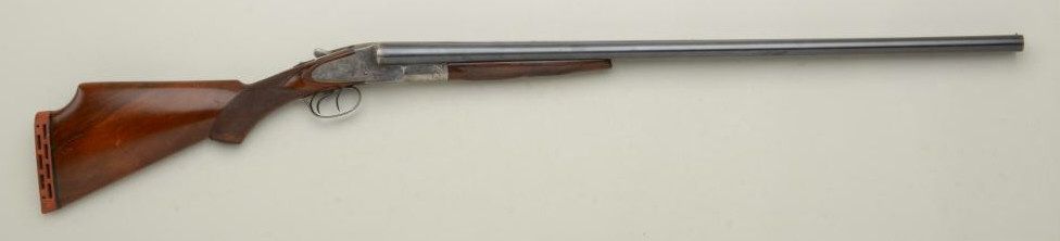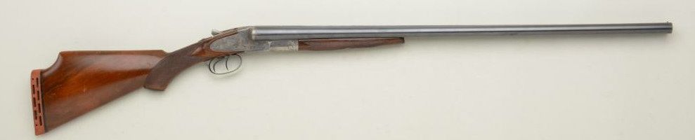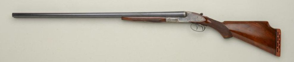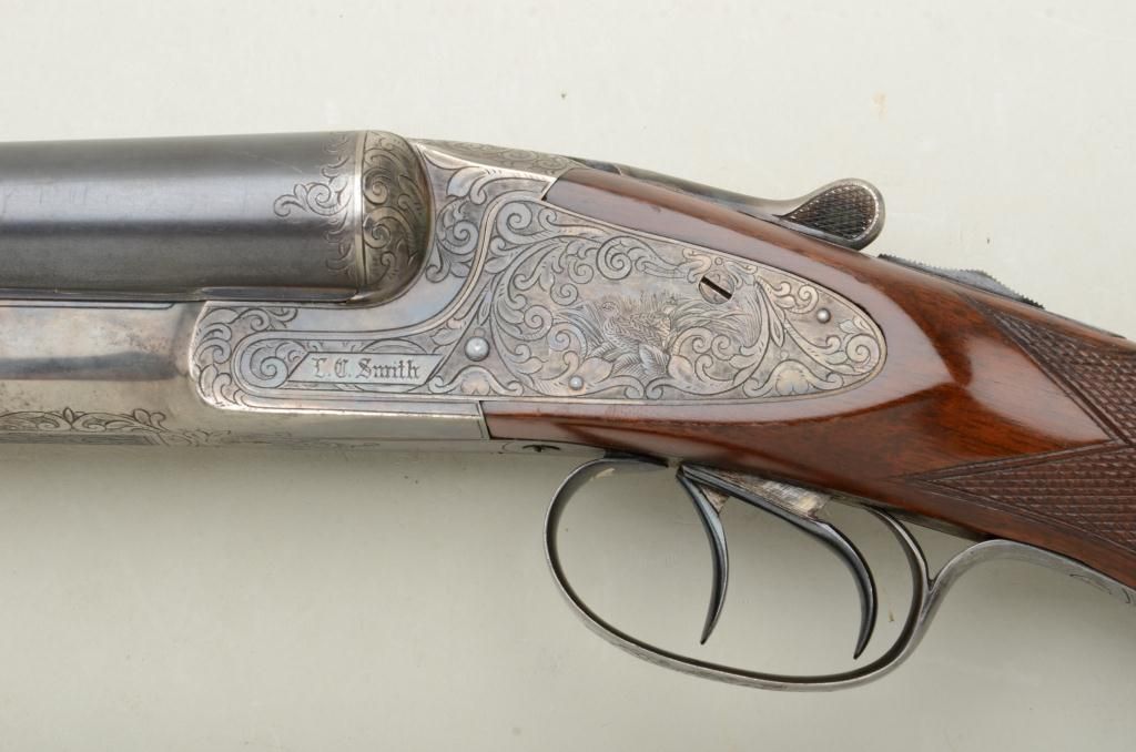 L. C. Smith Specialty Grade 12 gauge Trap stocked shotgun, 30" barrels, double triggers, auto ejectors, non-ventilated rib, high rise comb, serial #218329. The right barrel is choked improved modified tomodified, the left barrel is choked full to improved modified. The barrels retain 90-95% original blue drifting on the edges and muzzle, some minor spots and normal aging. The frame shows good quality engraving,matching the rear of the barrels with small panels of game birds on each side. The frame shows 60-75% case hardening, drifting to a light silvery patina, with still some good colors. The stocks show crisp checkering,most of the original varnish, and some scratches, dings and mars. The stock is fitted with an old possibly factory fitted Hy-gun pad with the last patent date 1927. The stock measures 14-1/4" to the end of thewood, 15-1/4" to the end of the pad. The gun locks tight, the bores are bright and near excellent. An interesting L. C. Smith that may be a sleeper for the collector and should be researched. Est.: $1,500-$3,000