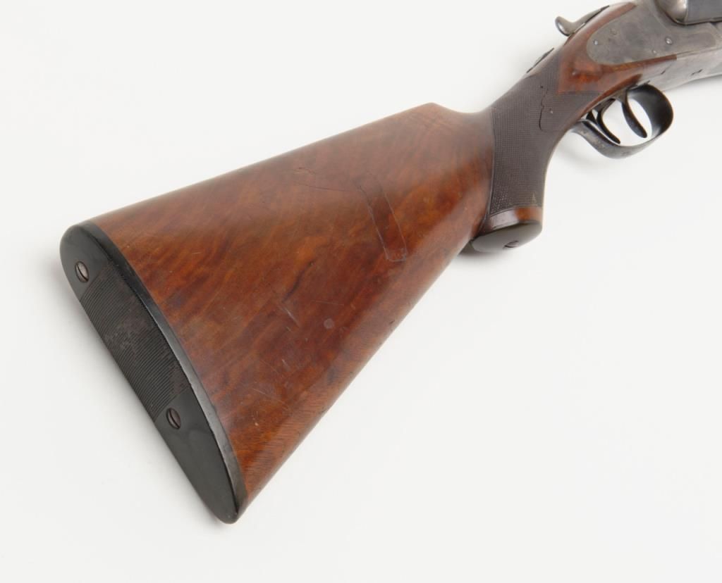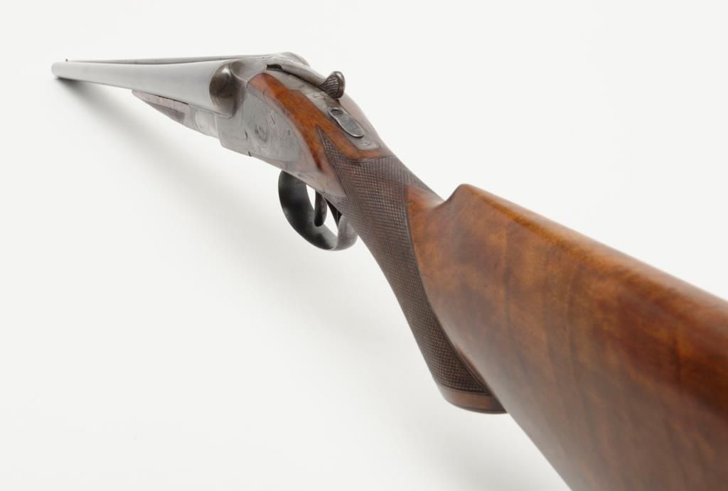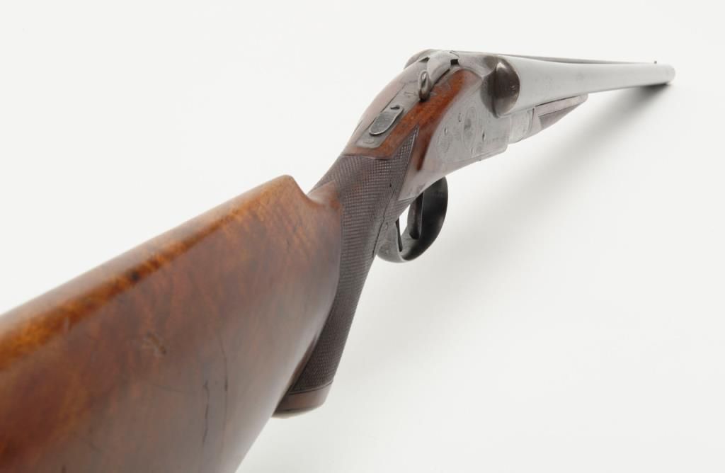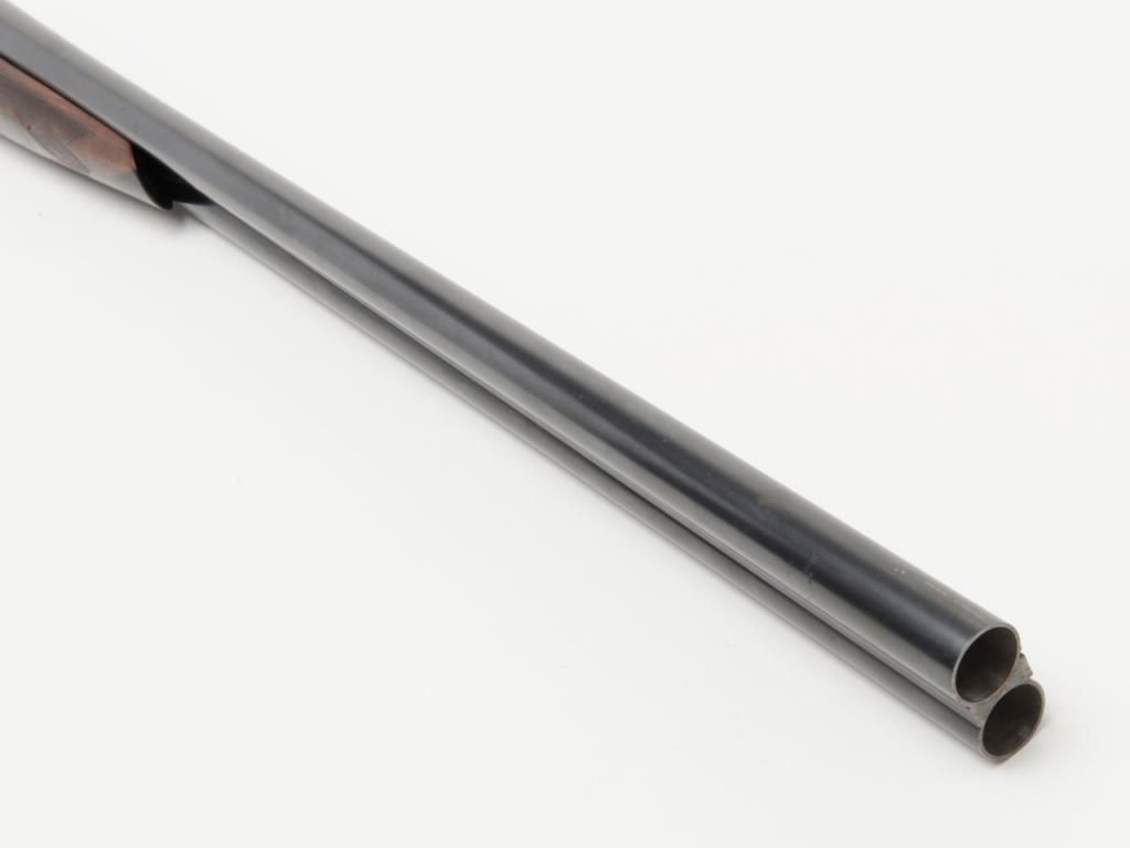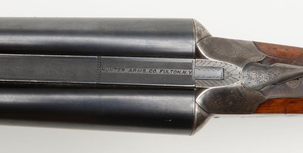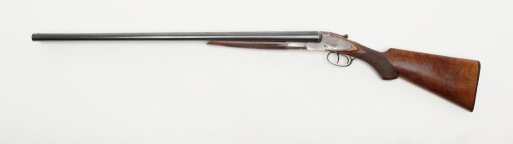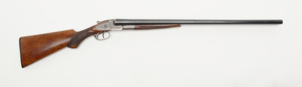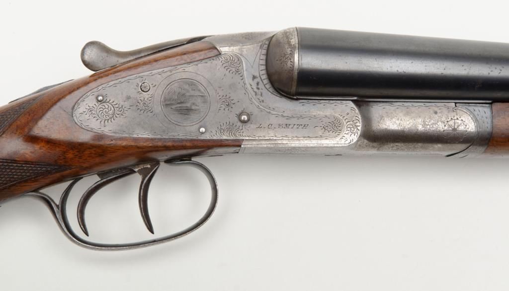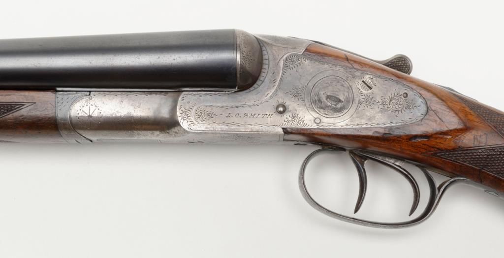L.C. Smith Specialty Grade Side by Side shotgun, cal. 12 gauge, Serial #310469. The shotgun is in overall very good to nearly fine condition, with 28” blued barrels. The barrels retain the majority of their blued finish with a full lengthrib and bead front sight. The finely checkered wood stocks are in only fair condition with numerous mars, compressions and an old pinned repair at the wrist. The sidelock action has gone to silver but retains significant muted casecolor and is nicely engraved with wildlife scenes and scroll. The stock has ebony inserts at the fore end, a horn grip cap and hard rubber butt plate. The bores are very good and may clean. The action locks tightly and the markings arecrisp. (C+R/PPT). Est.: $1,200-$2,400.