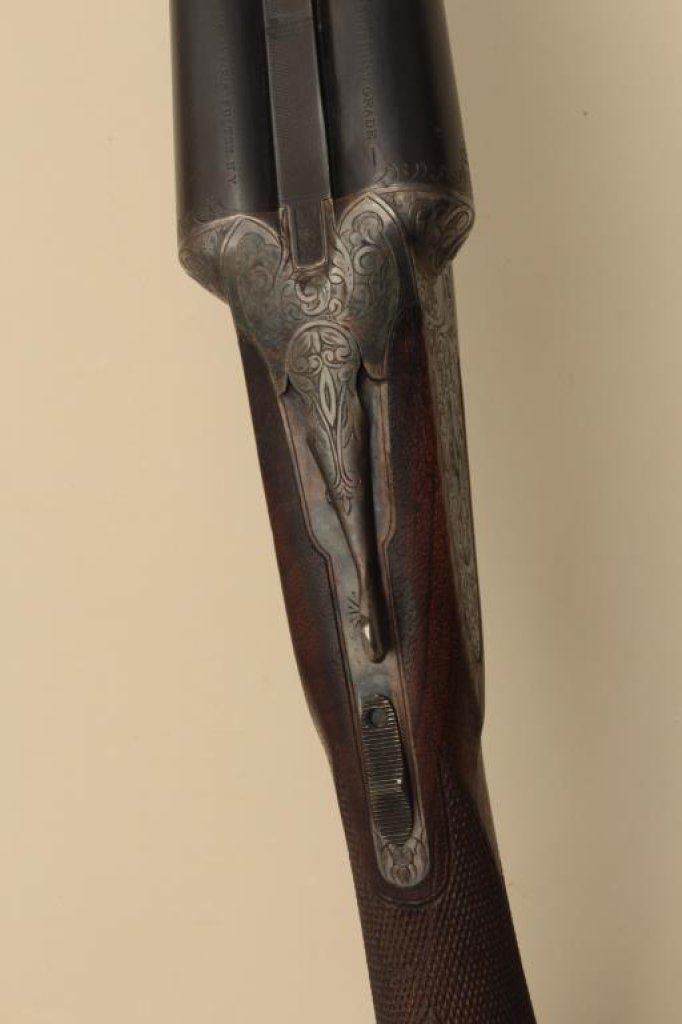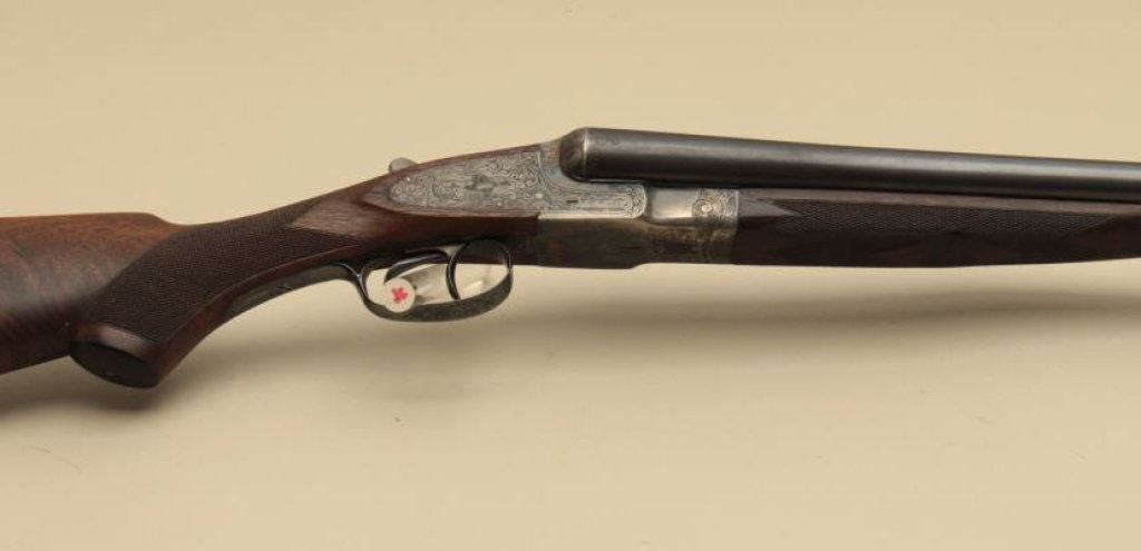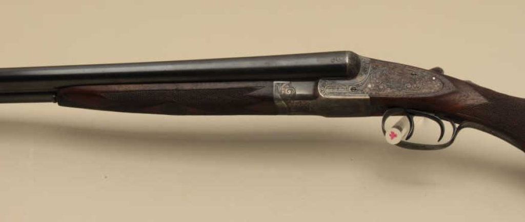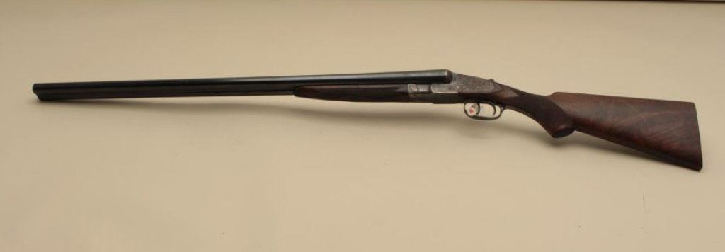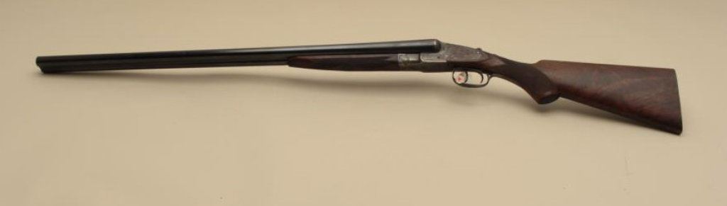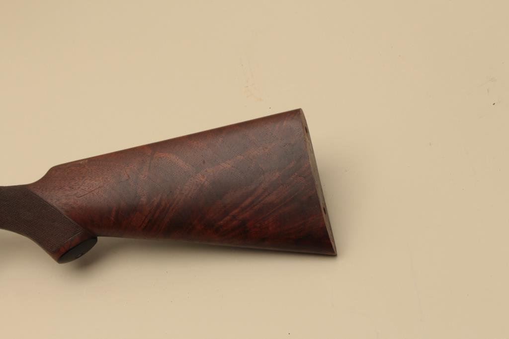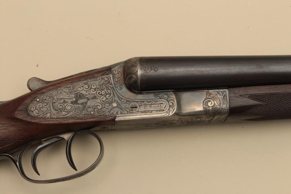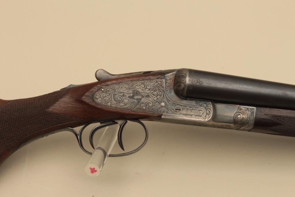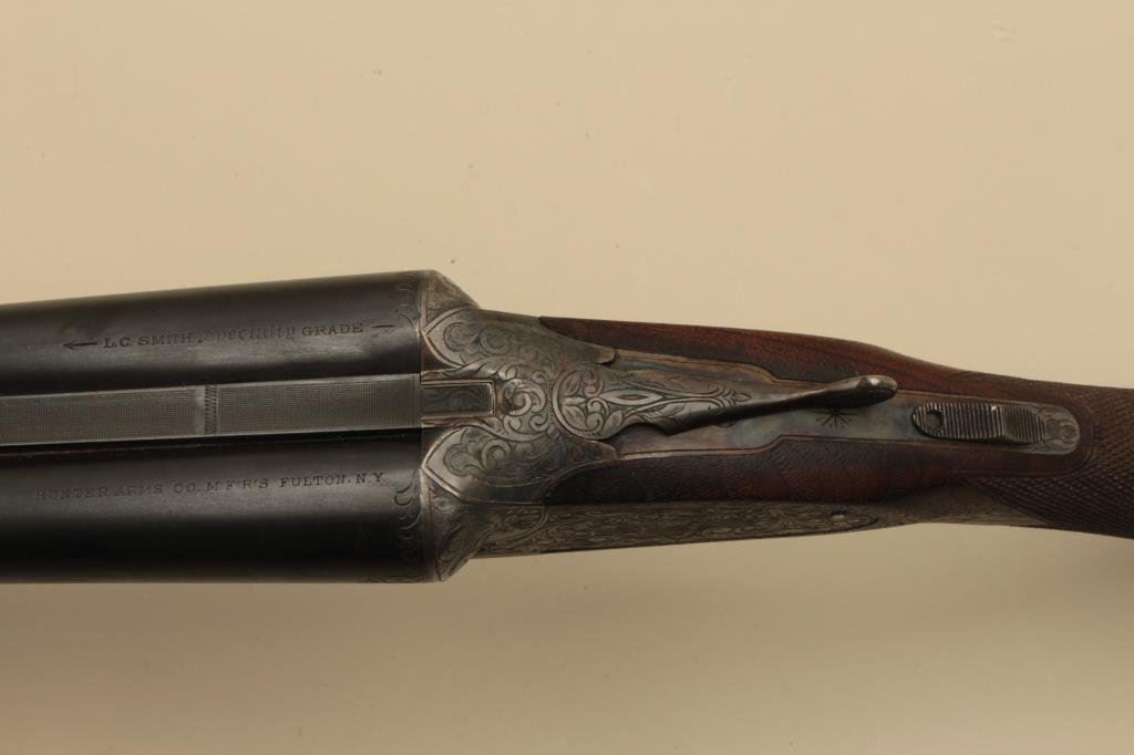 Serial #FW10168. The shotgun is in very good plus condition with 30” barrels with a full-length filed rib and ivory bead front sight. The barrels retain the majority of their blue finish with wear at the muzzle and small mars from carry and use. The finely engraved receiver shows significant muted case hardening with double set triggers, extractors and a tang mounted safety. The finely checkered wood stocks are in good condition with small mars and compressions. The butt stock is missing the butt pad but reflects a 14 ¼” LOP to the front trigger. The bores are good, the action crisp and markings are sharp on this nice L.C. Smith. (C+R). Est.: $800-$1,600.