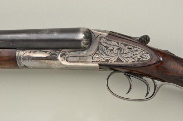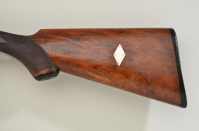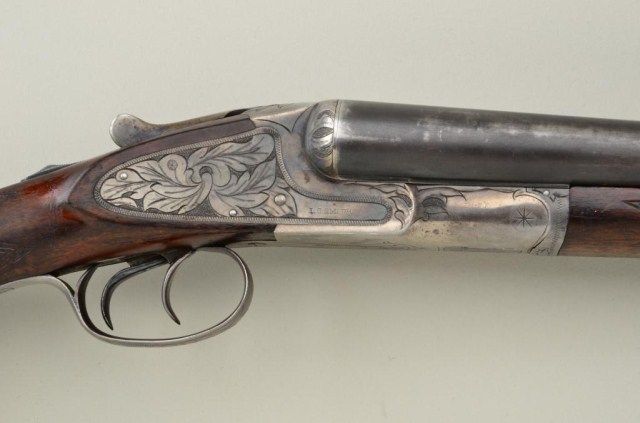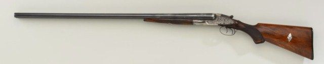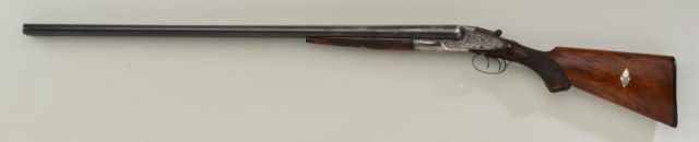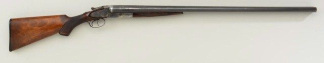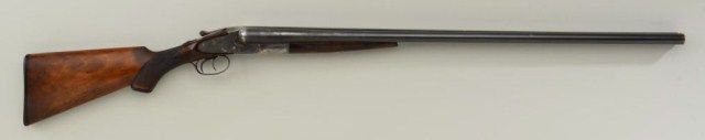 L.C. Smith by Hunter Arms Co. Field Grade SxS hammerless shotgun, 12 gauge, 32” barrels, blue and case hardened finish, checkered wood stocks, #215899. This gun is in overall very good condition showing the majority of itsmuted original blue finish on the barrels and approx. 70% original case colors on engraved receiver with balance gone to silvery tone; very good to fine bores, crisp actions, sharp markings and very good wood stocks withscattered wear to finish, some slight mars and scratches and a silver diamond plaque pierced into the left side of the butt stock. Est.: $700-$1,400.