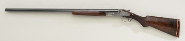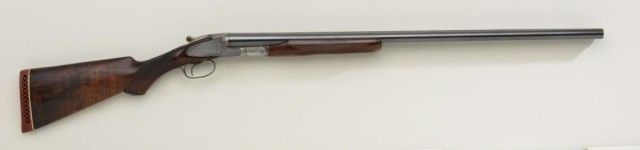 L.C. Smith double-bbl 12 gauge shotgun by Hunter Arms with extra set of BBL’s #204385. 29-1/2” original set of BBLs that have been reblued and choked about mod right and full left. Factory single trigger-auto ejector,forend replaced and broken butt stock lengthened, refinished and re-chocked. The locks are lightly engraved with 2 birds in each panel surrounded by light scrolls. The gun locks tight, bores are fair to good andmight improve with heavy cleaning. Two white beads on rib. An extra set of BBL’s #202392 are included and fit well, this set also refinished with fair to good bores and are choked improved – mod right, almost fullleft. The stock is 13” to the end of wood and 13-3/4” to end of pad. Needs a good restoration and inspection by gunsmith before shooting. Est.; $800-$1,600.