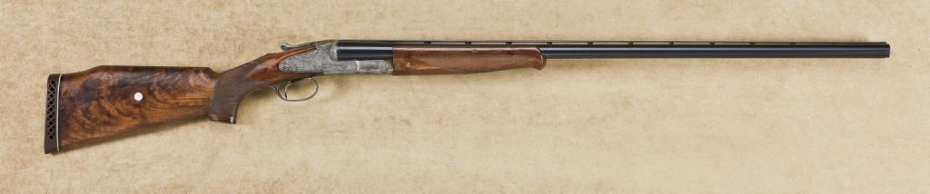 L. C. Smith specialty grade 12ga side by side shotgun, 32” barrels, factory ventilated rib, single trigger, auto ejectors, beavertail forend, serial number “94589”. The barrels show approx. 90-95% original bluefinish, some toning, some minor scratches and just beginning erosion and normal aging. The frame shows case hardened colors drifting to silvery grey with some faint colors mixed in and some just beginning areas of darkeningand erosion. The frame is lightly engraved with scrolls and game birds. The pistol grip cap has been replaced with a horn and a hard rubber recoil pad has been added. The checkering has been refreshed. The stockmeasures approx. 13-3/8” to the end of the wood, approx. 14-1/4” to the end of the pad. The action tight, the bore is near excellent. Est.: $2,000-$4,000