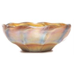 Large L.C. Tiffany bowl, scalloped form in gold favrile glass with iridescent highlights, signed L.C. Tiffany Favrile, 9.5”h