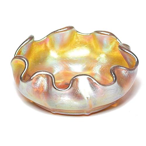 L.C. Tiffany bowl, small form with pinched rim in gold favrile glass with platinum iridescence, signed L.C.T., 2.5"w