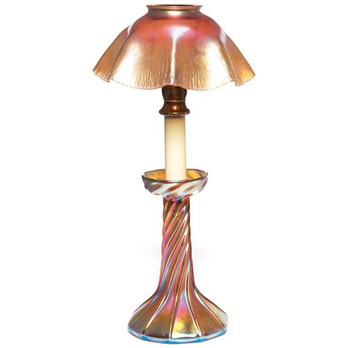 L.C. Tiffany candlestick lamp, favrille glass base and shade with good overall iridescence, base signed L.C.T. Favrille, shade signed L.C.T, 14.5"h