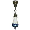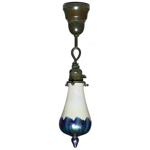 Rare L.C.Tiffany hanging lamp, opalescent favrile glass shade with a pulled iridescent design over blue, signed L.C.T.#C468, held by a bronze ceiling fixture with its original patina,18in.l,very nice, quite unusual