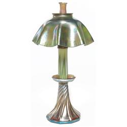 Unusual L.C. Tiffany kerosene lamp, favrile glass, center shaft carrying a pulled green feather design, shade with green and purple iridescence and veining, signed L.C.T. and paper label on base, impressed The Twilight on fitter rim, 13.75”h, complete with the original glass chimney