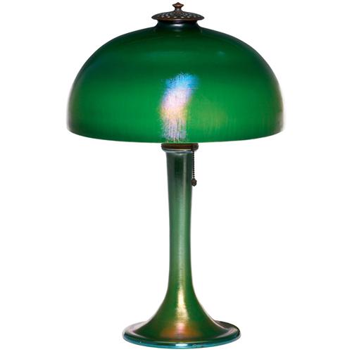 Unusual L.C. Tiffany lamp, favrile glass base and shade in vibrant iridescent green, exceptional veining to rim of shade which is signed L.C.T., base is signed L.C. Tiffany Favrile #2769, 10"dia. x 15.5"h