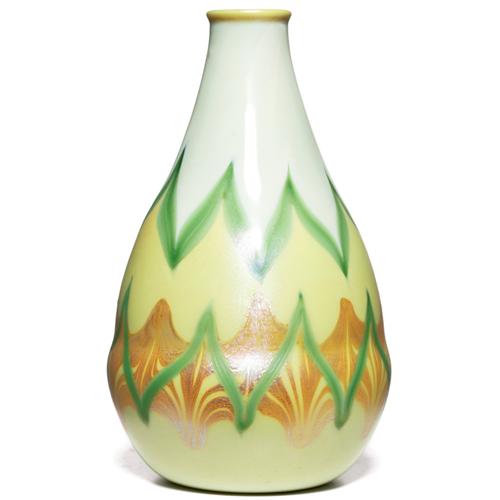 L.C. Tiffany vase, attribution, gourd form with pulled designs in green, yellow and gold on an opaque white ground, unsigned, 7.5"h
