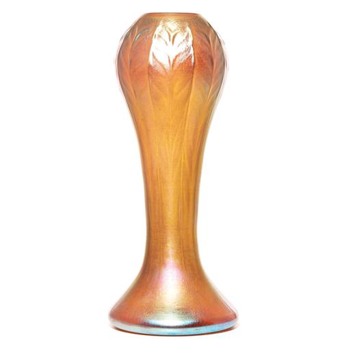 Unusual L.C. Tiffany vase, rare shape and technique with a raised feather design in gold iridescent glass, signed L.C. Tiffany Inc. Favrile 1558, paper label, 11"h, excellent piece