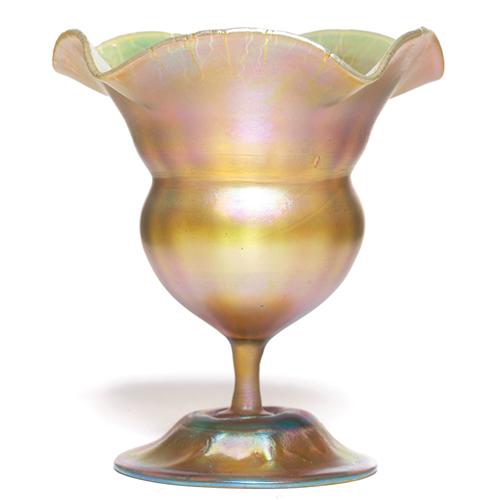 L.C. Tiffany vase, footed form with ruffled rim in gold favrile glass with pink, green and silver iridescence and veining at rim, signed L.C.T., #W4770, 5"h