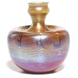 Good L.C. Tiffany vase, squat form in favrile glass with unusual and elaborate pulled designs, signed L.C. Tiffany Favrile, 4"h