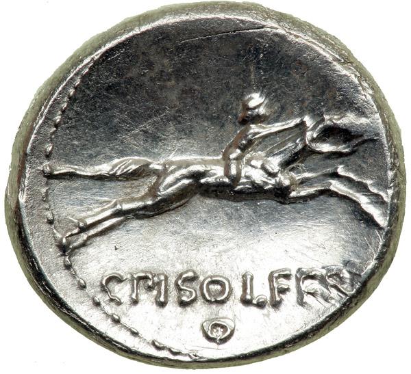 L. Calpurnius Piso L.f. Frugi, moneyer. AR Denarius minted at Rome, c. 67 BC. Laureate head right of Apollo; behind, letter. Reverse: Horseman holding palm branch, riding right; below, letter. Calpurnia 24; Crawford 408. High relief and lustrous. Virtually Mint State.