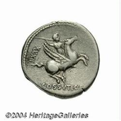 L. Cossutius C. f. Sabula. 72 B.C. AR denarius (18 mm, 3.60 g). Winged head of Medusa left, hair entwined with serpents / Bellerophon riding Pegasus right, hurling spear. Crawford 395/1; Sydenham 790; Cossutia 1. VF. Scarce. Important notice: Heritage usually auctions material at the rate of 200-250 lots per hour. On some occasions eBay Live bid software or the Internet may not be able to keep up with the pace of the auction. We recommend placing a realistic absentee bid now as insurance to avoid disappointment. Occasionally the auctioneer may eliminate or reject an eBay Live bid, and the auctioneer may also reopen a lot after the close of the eBay live bidding (usually because we missed an audience bid), and may reject your bid even if it shows you as the winning bidder. By bidding via eBay Live, you agree that Heritage may award the lot to another bidder at its sole discretion under the circumstances described above or any other reasonable circumstances. Also please note that all Heritage lots purchased through eBay Live carry a 20% Buyer's Premium. Please make sure you read the Terms and Conditions before you bid.