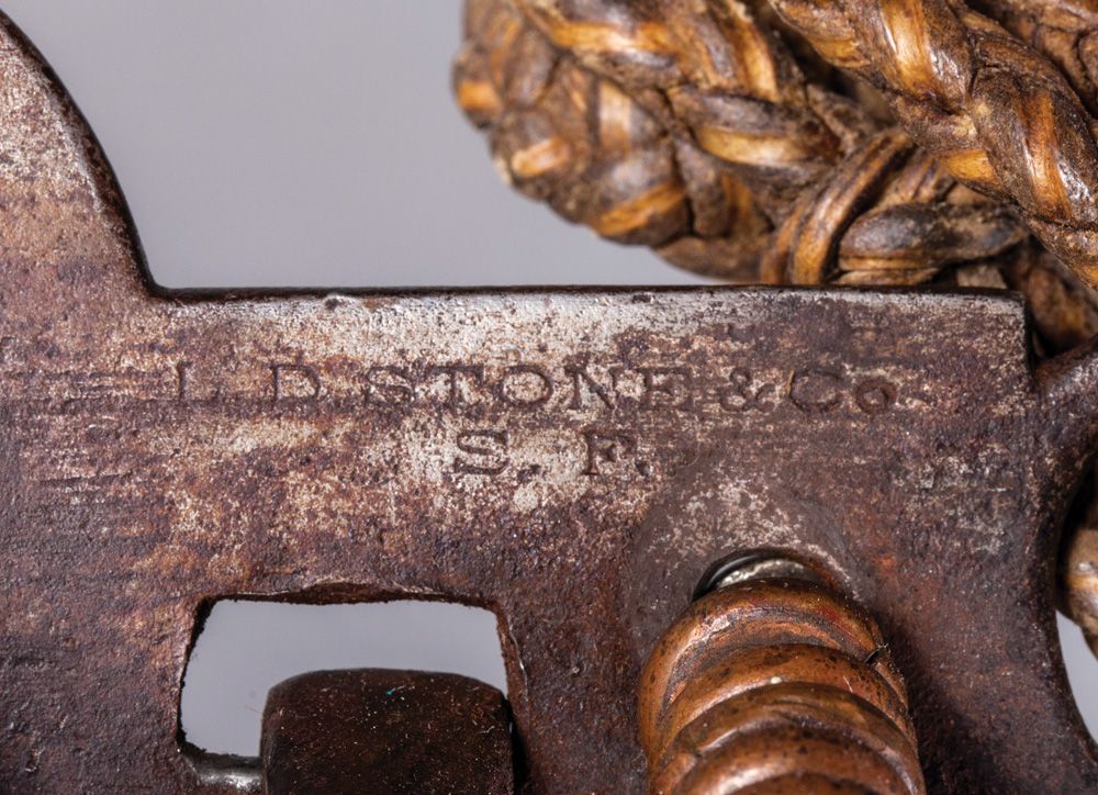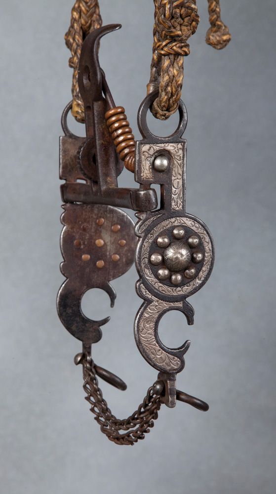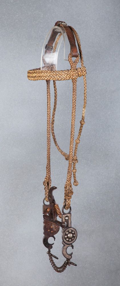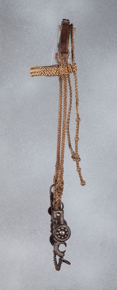 L.D. Stone Bit with Rawhide Bridle. Well marked "L. D. Stone & Co. - S. F." (San Francisco) target pattern over kissing birds bit, with early style spade. The headstall is a very high quality flat and round rawhide with 8 plait reins and romel.