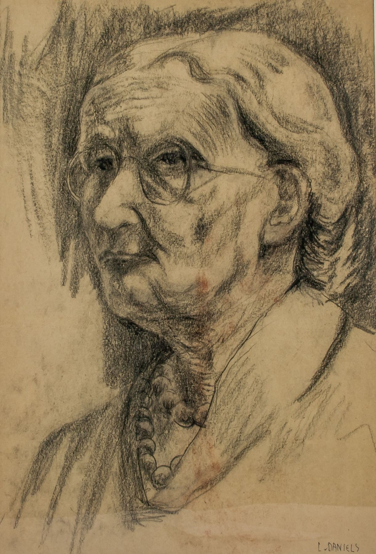 Charcoal on paper, portrait of an old lady framed. Signed on lower right corner. 16.5 x 11.5 inch (42 x 29 cm)