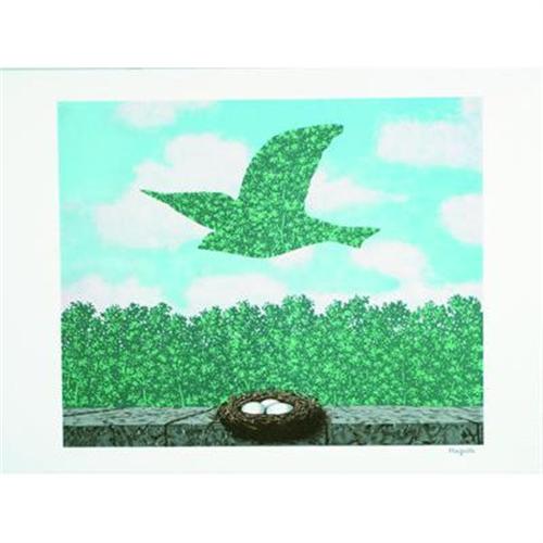 Notes:Lithograph after (d'apres) Magritte, facsimile signed with Magritte Estate watermark, authorized by ADAGP, France. Printed on pure chiffon, Velin de Rives, 300 gr/square meter. This image was recreated by a master engraver and required over eighteen passes through a flat-bed lithographic press to be completed. Each print is signed in the plate, stamped with the seal of the Magriite Estate and signed by the publisher on the verso. This is part of an editon of 300 and measures 22 3/4 x 30 3/4 inches. Le Printemps (Spring) was done in 1965 and part of a private collection. Here Magritte plays not only with everyday objects but also with ordinary subjects. A bird, a nest, the blue sky and invasive greenery make up this spring, again and always a symbol of rebirth. A wink of the eye under the guise of a cliché but in spite of the surrealist distance, the celebration of a theme dear to all artists.