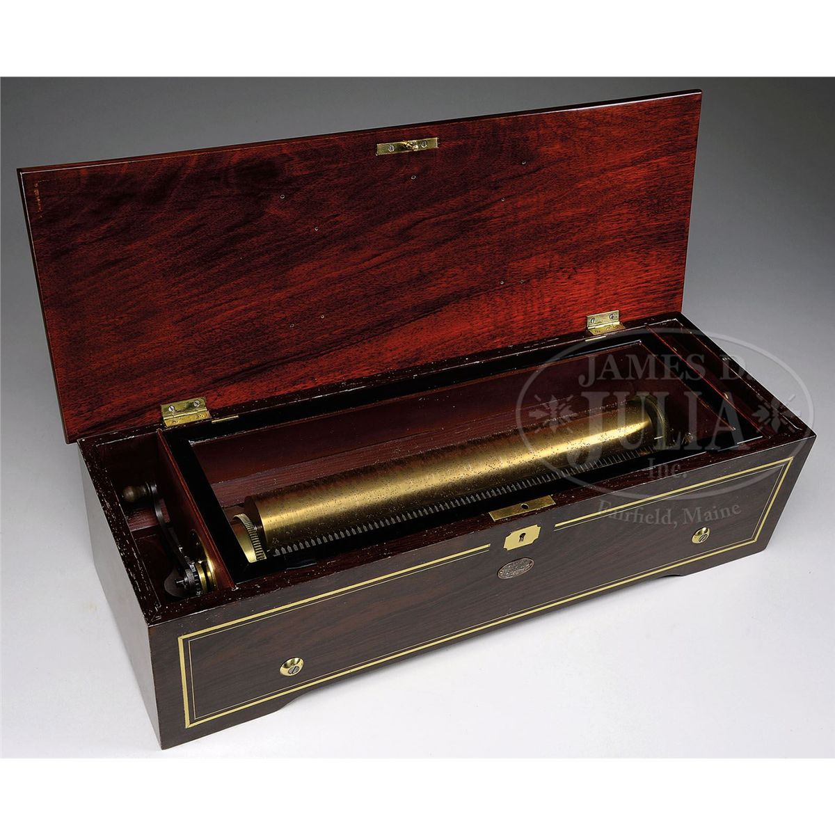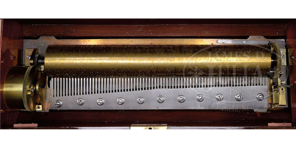 Cylinder is exceptionally long at 16-1/2", playing 12 tunes. Has solid cast brass bed plate, along with brass gears and governor. Case appears to be ebony with brass border inlay and large brass inlay in center of lid, 4" tall by 8" wide. Inside has a mahogany finish. Tune card is missing. Dealers name tag on front. SIZE: 26-1/2" w x 9-1/2" d x 7" t. CONDITION: Movement was restored some time ago and is still in excellent condition, but no protective coating was put on the brass. Should be brightened and coated. All teeth and dampers are restored. Case is professionally refinished with old brass highly polished showing a very few age cracks. 1-13521