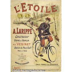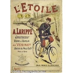 <B>L'Etoile Bicycles (Charles Verneau, Circa 1915)</B></I> Advertising Poster (39.5" X 55"). An unusual advertising depiction of military use for bicycles. A French dispatch rider sets out on a L'Etoile bike, one of the myriad nameplates that have disappeared over the years. Though the award medals date from the 1890s, the military action seems to be from the WWI. Poster has been on vintage canvas and would benefit from relining. Good/Very Good condition on Canvas.